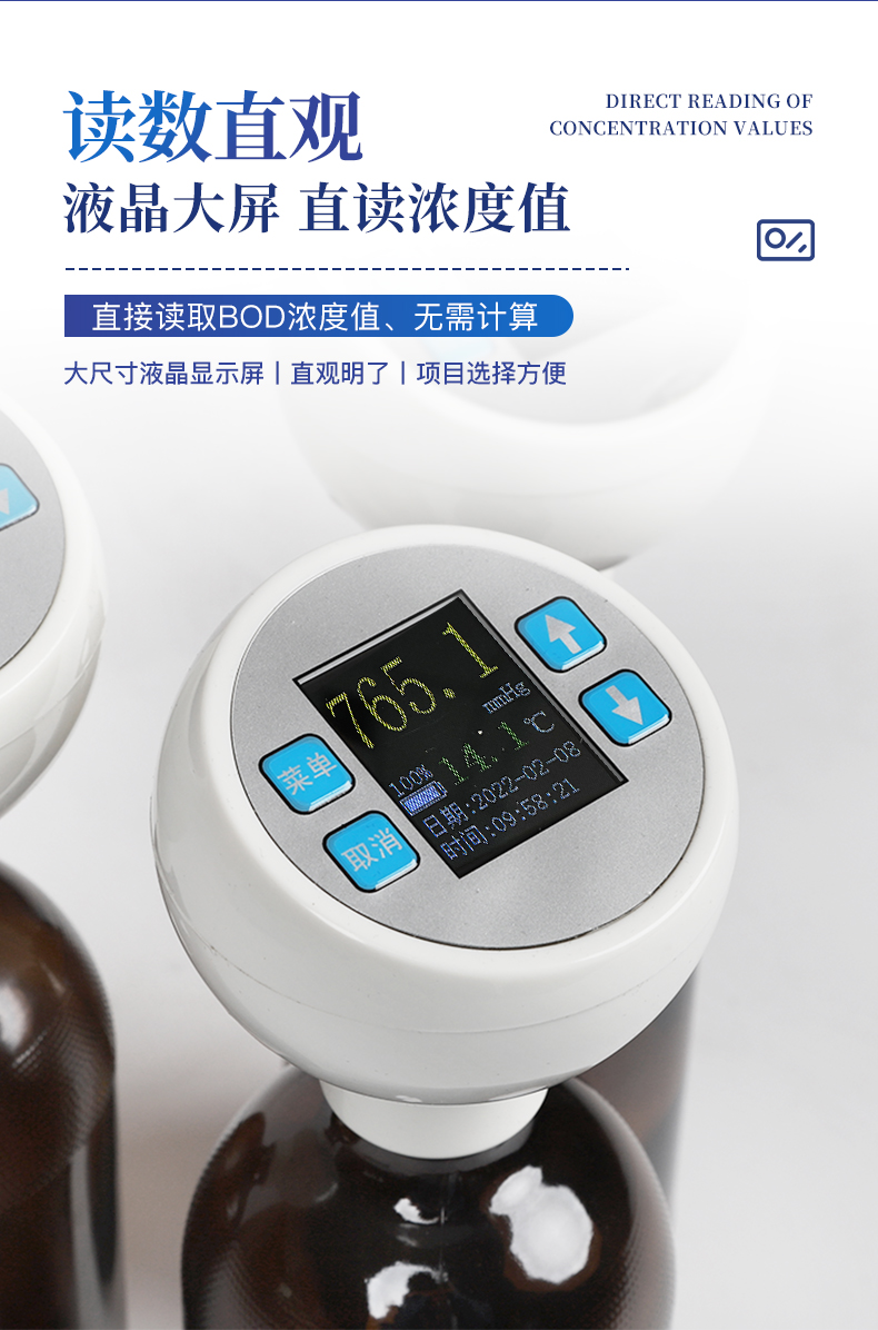 1. 可同时测量六个样品; 2. 六个独立测试终端,在检测过程中可随时加入新的测量组; 3. 直接读取BOD浓度值、无需计算; 4. 无汞压差设计,精度高,无需换算,且保证实验人员安全健康; 5. 实验环节无管路设计,避免管路老化、漏气等弊端; 6. 测量范围可选择,在水样浓度低于4000g/L时,无需稀释; 7. 测定仪自动记录测量数据,一个测试周期可选60个采样点、检测数据更**; 8. 培养周期可调节,根据需求可以选择; 9. 自动完成测量过程,无需专人值守; 10. 大尺寸液晶显示屏,直观明了,项目选择方便; 11. 测试终端自带大容量电池,电池寿命2年以上,测试过程中不受外部环境短期断电影响; 12.记录频率2h记录一次.