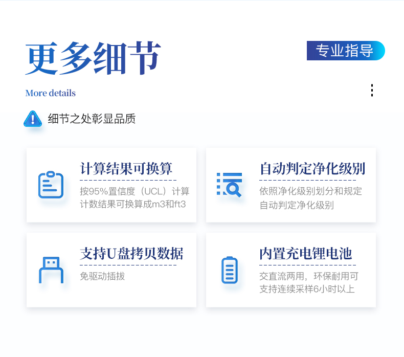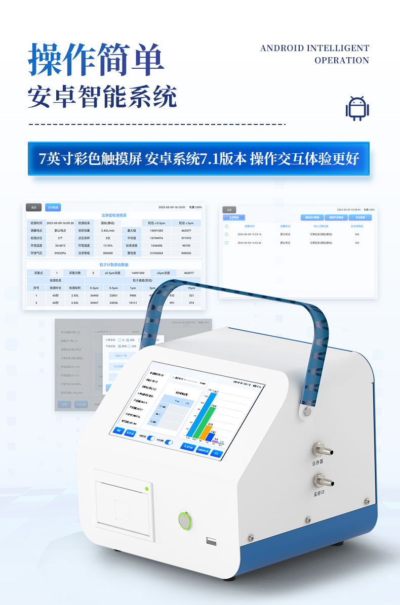| 1、安卓系统7.1版本,操作交互体验更好。 | 2、内置温湿度传感器、环境气压传感器 | 3、核心部件光散射传感器明显消除腔体的杂散光,信噪比大为提高。从而使测量更准确更可靠。 | 4、按95%置信度(UCL)计算,计数结果可换算成m3和ft3 | 5、依照净化级别划分和规定,自动判定净化级别,使用便利。 | 6、带审计追踪功能,可查询、可追溯、可控制,符合FDA 21CFR PART11规范 | 7、支持wifi、蓝牙传输,数据可无线上传;同时支持U盘拷贝数据,免驱动插拔。 | 8、配置监管平台,检测结果可直接无线传至平台,进行洁净度长短期分析,辅助管理。 | 9、内置新一代高速热敏打印机,可选择所需要打印的粒径通道,灵活打印结果。 | 10、交直流两用,内置充电锂电池,环保耐用可支持连续采样6小时以上。 | 11、便捷简易伸缩式云台支架,安装采样操作更加方便。 |