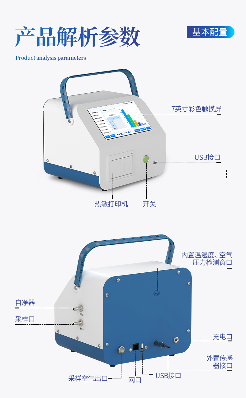 | 采样量:2.83L/min (0.1cfm) | 六粒径通道:0.3,0.5,1.0,3.0,5.0,10.0(μm) | 自净时间:≤10min | 粒径分布误差:0.5um 5um ≤±30% | 粒子浓度示值误差:0.5um ≤±30% | 测量重复相对偏差:≤±10% | 使用环境:工作环境15~35℃, 10-85%RH | 采样周期:可从1秒至30000秒开始任意设定 | 采样延时:≤60s | 测量间隔:≤60s | 采样方式:单次、≤99次(自定)、连续 | 报警功能:通过设置报警参数实现颗粒数报警 | 光源:进口半导体激光二极管(寿命大于30000小时) | 屏幕显示方式:7寸彩色触摸屏 | 数据内存容量:1--10万条,可查询,可导出。 | 充电时间:2小时 | 设计工作时间:8小时 | 平均功率:7.5W | 内置电池:74Wh(16.8V/5Ah) | 充电器:50W(16.8V/3A) |