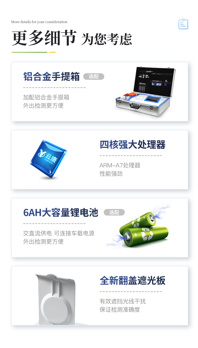 2、仪器检测模块标准化、智能化,检测项目可随意自由组合。检测箱体内置多个标准检测单元,检测模块可以调整配置。