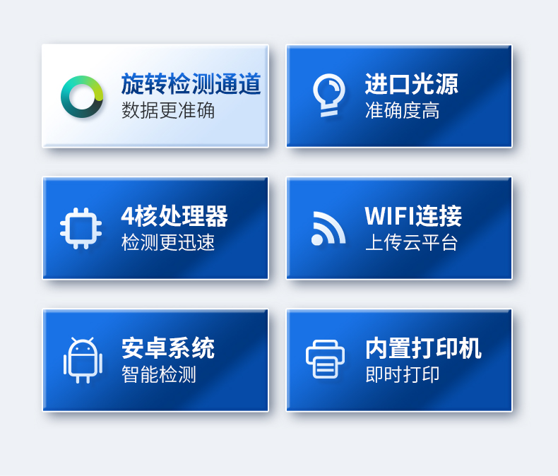 3、显示屏幕:仪器采用7英寸液晶触摸屏,搭配运行安卓智能操作系统,主控芯片采用ARM Cortex-A7,RK3288/4核处理器,主频1.88Ghz,操作方便,性能更强。