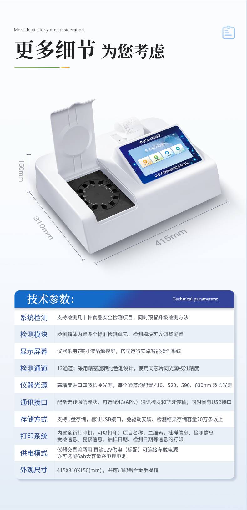 1、仪器采用台式一体化系统检测技术,将分光光度模块、数字化管理模块、无线通讯模块高度集成于一体,支持检测几十种食品安全检测项目,同时预留升级检测方法。