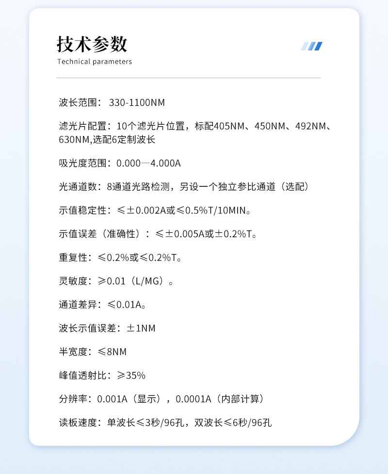 *滤光片配置:10个滤光片位置,标配405nm、450nm、492nm、630nm,选配6定制波长