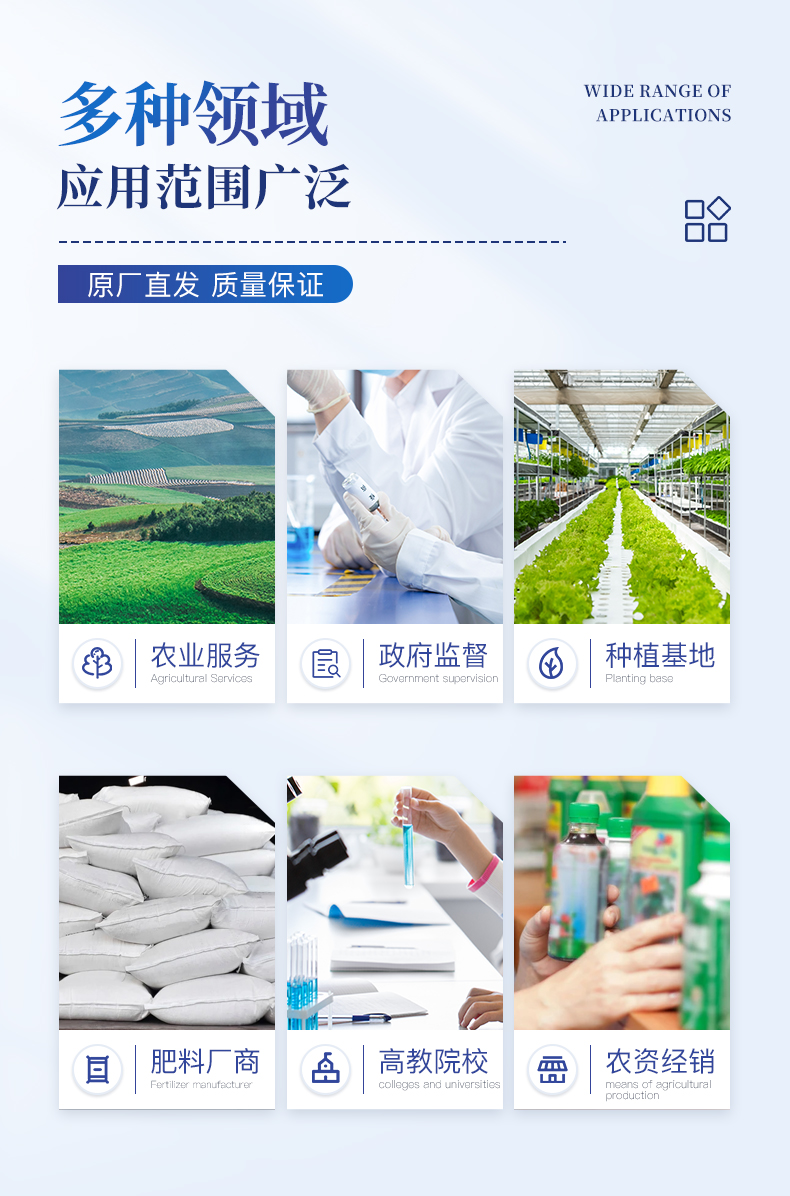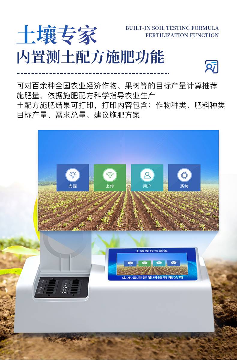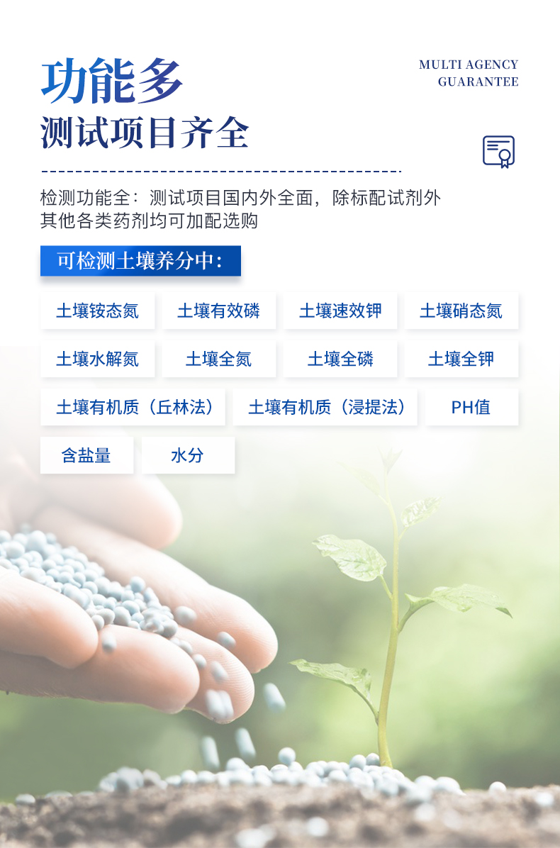 配套齐全:该仪器相当于一个小型实验室,无需用户自配附件。适于农业服务部门或农资经销商、合作社、肥料厂商、大种植户测土施肥。