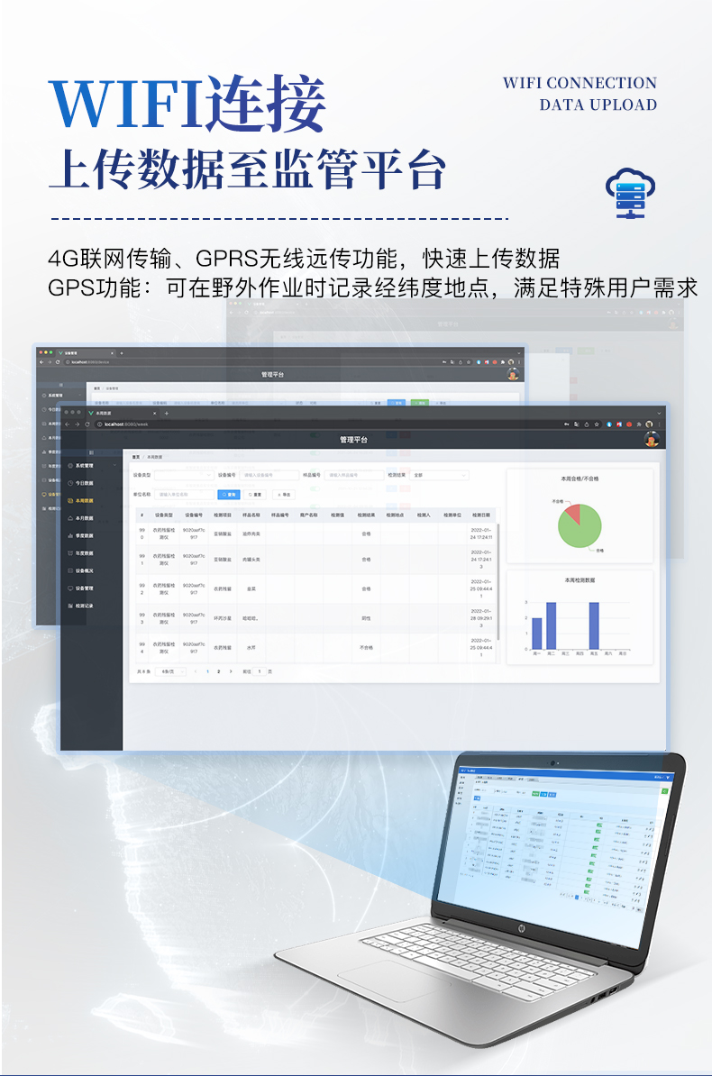 6、仪器标配wifi无线上传、4G联网传输、GPRS无线远传功能,快速上传数据。
