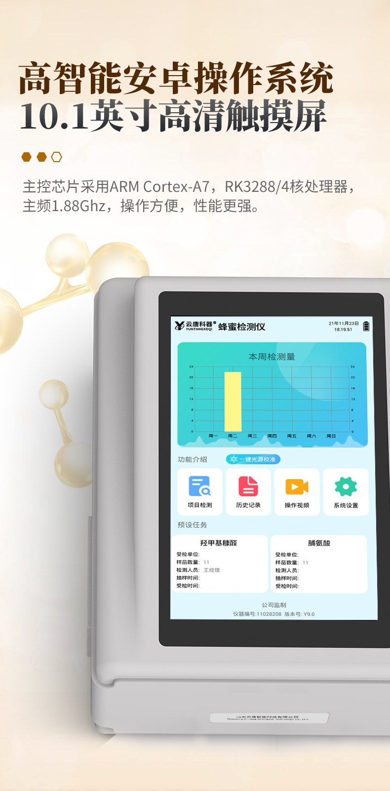 山东云唐智能科技有限公司生产的蜂蜜检测仪为集成化食品安全快速检测分析设备,采用台式一体化设计,可可检测体现各类蜂蜜品质的蔗糖、还原糖(葡萄糖和果糖)、羟甲基糠醛、农药残留、兽药残留、重金属等项目定性定量检测。