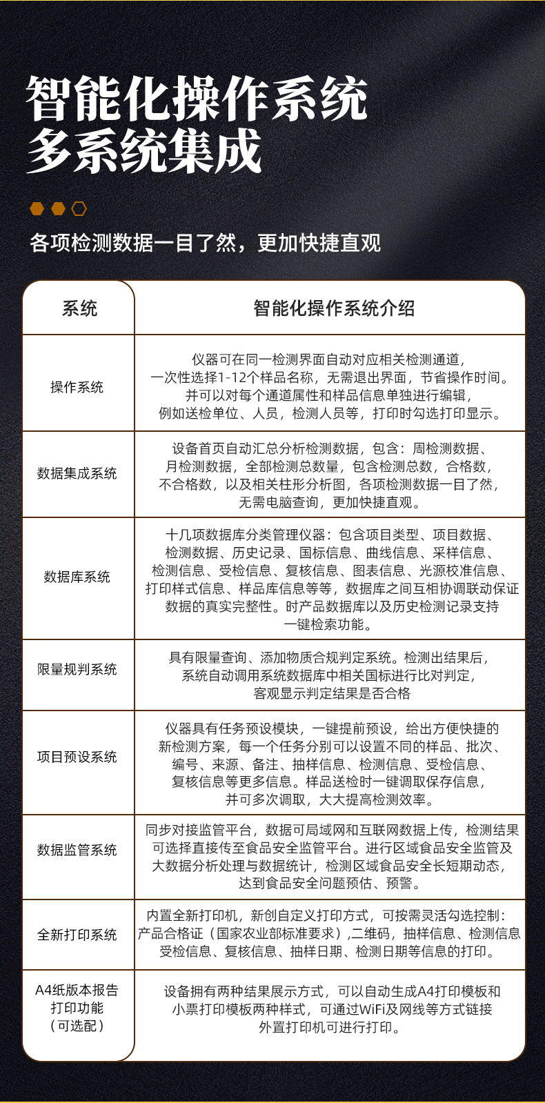 1、仪器采用台式一体化系统检测技术,将分光光度模块、胶体金检测模块、新型农残检测模块、数字化管理模块、无线通讯模块高度集成于一体,支持检测200种食品安全检测项目,同时预留升级检测方法。