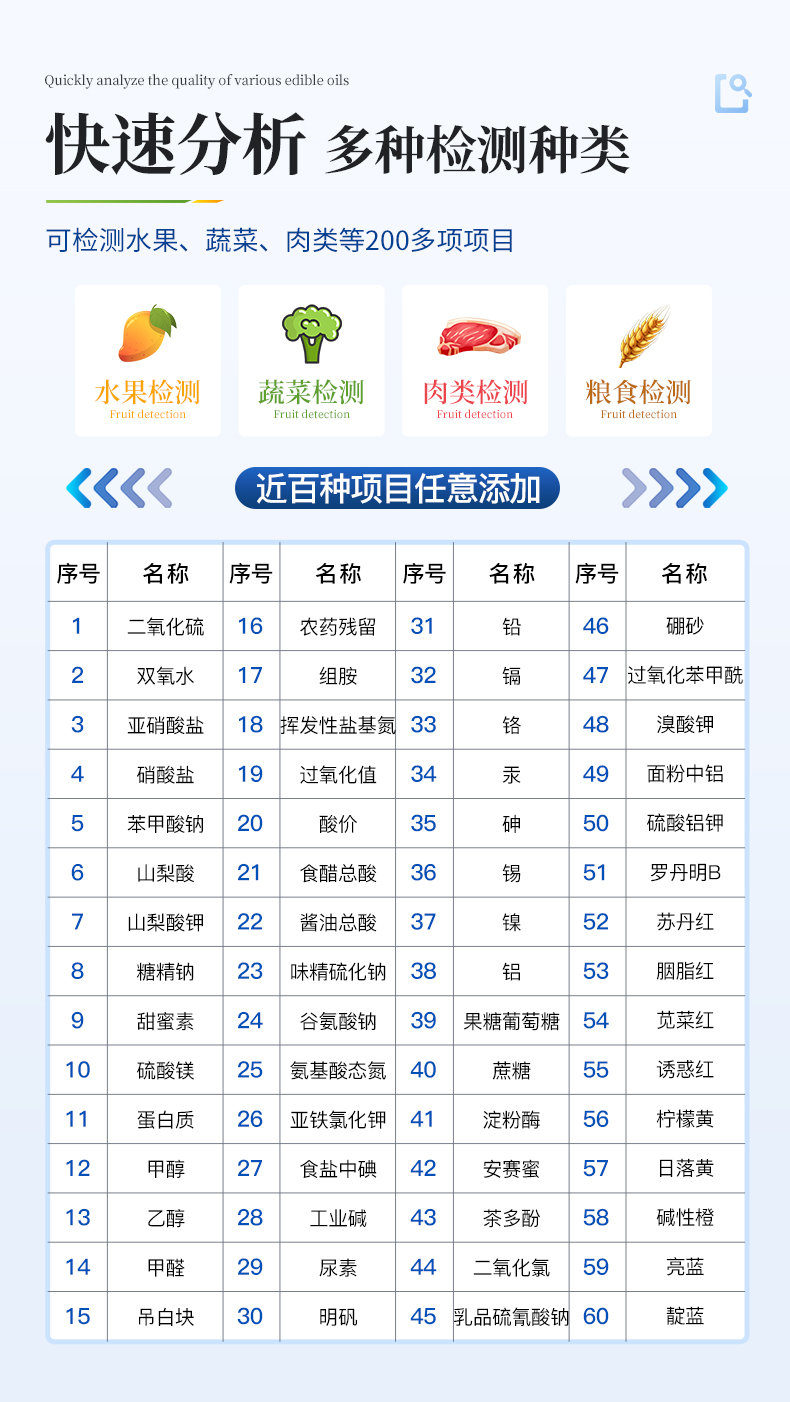 | 1、仪器采用台式一体化系统检测技术,将分光光度模块、数字化管理模块、无线通讯模块高度集成于一体,支持检测几十种食品安全检测项目,同时预留升级检测方法。 | 2、仪器检测模块标准化、智能化,检测项目可随意自由组合。检测箱体内置多个标准检测单元,检测模块可以调整配置。 | 3、显示屏幕:仪器采用7英寸液晶触摸屏,搭配运行安卓智能操作系统,主控芯片采用ARM Cortex-A7,RK3288/4核处理器,主频1.88Ghz,操作方便,性能更强。 | 4、检测通道:≥12通道;采用精密旋转比色池设计,使用同芯片同光源校准精度,解决不同光源之间的误差值,更加准确**。 | 5、仪器光源:高精度进口四波长冷光源,每个通道均配置 410、520、590、630nm 波长光源,标配**的光路切换装置,专利光路切换功能可实现64波长,并且所有检测项目可实现所有通道同时检测。 | 6、通讯接口:配备无线通信模块、可选配4G(APN)通讯模块和蓝牙传输,同时具有USB接口,可以多方式实现数据保存及数据传输。 | 7、存储方式:支持U盘存储,标准USB接口,免驱动安装。检测结果存储容量20万条以上,可生成Excel表格进行拷贝,并具有登录保护功能。 | 8、智能化操作系统: | 8.1、操作系统:仪器可在同一检测界面自动对应相关检测通道,一次性选择1-12个样品名称,无需退出界面,节省操作时间。并可以对每个通道属性和样品信息单独进行编辑,例如送检单位、人员,检测人员等,打印时勾选打印显示。 | 8.2、限量规判系统:具有限量查询、添加物质合规判定系统。检测出结果后,系统自动调用系统数据库中相关国标进行比对判定,客观显示结果是否合格。 | 8.3、数据监管系统:同步对接监管平台,数据可局域网和互联网数据上传,检测结果可选择直接传至食品安全监管平台。进行区域食品安全监管及大数据分析处理与数据统计,检测区域食品安全长短期动态,达到食品安全问题预估、预警。 | 8.4、打印系统:内置全新打印机,可以打印:项目名称,二维码,抽样信息、检测信息,受检信息、复核信息、抽样日期、检测日期等信息的打印。 | 9、供电模式:仪器交直流两用,直流12V供电(标配),可连接车载电源,亦可选配6ah大容量充电锂电池,电量可实时显示,方便户外流动测试。 | 10、仪器具有重新校准、锁定、恢复出厂设置功能, | 11、外观尺寸:415X310X150(mm) ,并可加配铝合金手提箱 |