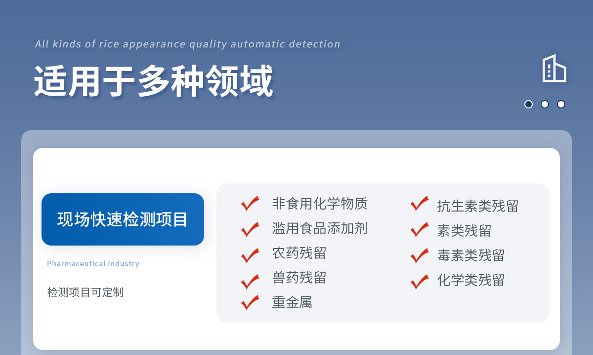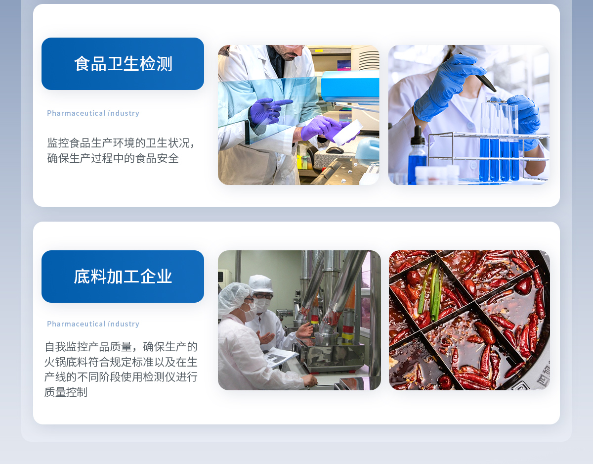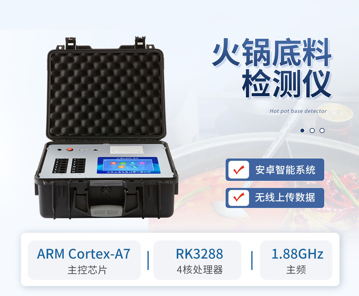 可现场快速检测底料中非食用化学物质、滥用食品添加剂、农药残留、兽药残留、重金属、抗生素类残留、激素类残留、毒素类残留、化学类残留等多项目的快速定性定量检测。如底料中的山梨酸钾、苯甲酸、甜蜜素、安赛蜜、黄曲霉B1等快速检测。 该多功火锅底料检测仪为集成化食品安全快速检测分析设备,广泛应用于食药监局、卫生部门、底料加工、工商执法等单位使用。