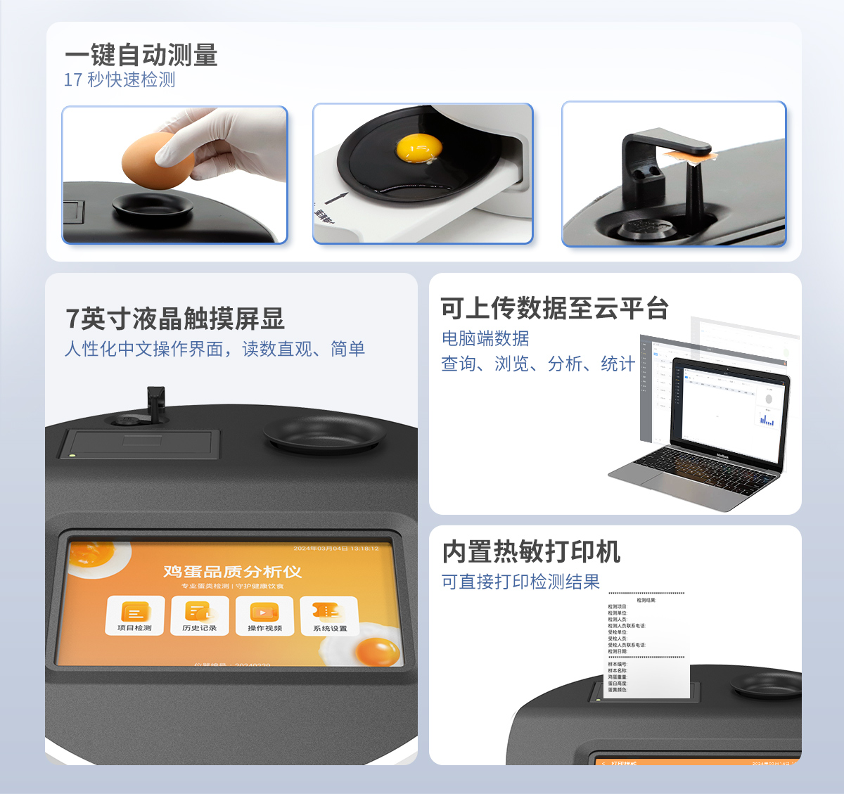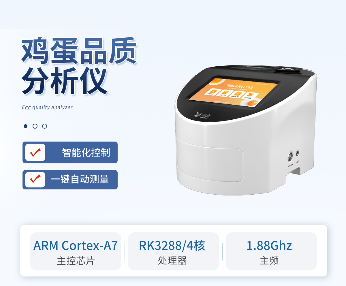 | 1.仪器采用7英寸液晶触摸屏,搭配运行安卓智能操作系统,主控芯片采用ARM Cortex-A7,RK3288/4核处理器,主频1.88Ghz,操作方便,性能更强。 | 2.仪器采用智能化控制,可一键自动测量蛋重、蛋白高度、新鲜度(哈夫单位)、蛋黄高度、蛋壳厚度。 | 3.高精度数字传感器,测量结果精度高,稳定性好。 | 4.创新采用高精超声波传感器测试蛋白高度,精密传感器测试蛋黄颜色,无需直接接触蛋液,减少误差存在。 | 5.仪器测试性能稳定,不受操作人员的能力影响,方便简单。 | 6.可一键自动测量哈夫单位、蛋重、蛋白高度、蛋黄高度和蛋壳厚度,把测试时间缩短到 17 秒。 | 7.仪器可本机存储数据,可连接USB端口将数据导出存储。另外,仪器自带数据上传模块,具有WIFI联网上传、RJ45网线连接功能,数据可实现局域网和互联网数据上传,检测结果可选择直接传至数据平台,进行大数据分析处理与数据统计,达到长期分析监测的目的。 | 8.打印系统:内置全新打印机,可以打印项目名称、二维码、抽样信息、检测信息、受检信息、复核信息、抽样日期、检测日期等信息。 | 9.供电模式:仪器交直流两用,直流12V供电(标配),可连接车载电源,亦可选配6ah大容量充电锂电池,方便户外流动测试。 | 10.仪器具有重新校准、锁定功能。 | 11.检测指标: | (1)蛋白高度测量范围:0.0~40.0mm,精度:0.1mm ; | (2)蛋重测量范围:0~250g,精度:0.1g ; | (3) Haugh unit 值范围:0~130HU; | (4)国际等级:AA:≥72,A:71~60,B:59~31,C:≤30; | 12.外观尺寸:340*290*238mm(长*宽*高),仪器重量:5.05kg。 |