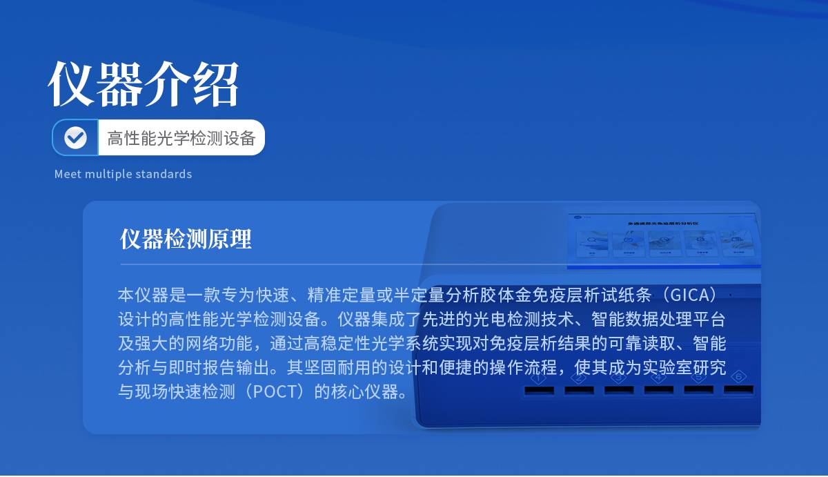 | 1、食品安全: 致病微生物、农兽药残留、生物毒素等快速筛查。 | 2、畜牧兽医: 动物疫病诊断、动物源性安全指标检测。 | 3、环境监测: 水质、土壤特定污染物筛查。 | 4、科研与生物安全: 免疫层析实验定量分析、生物因子检测。 | 5、其他领域: 所有使用胶体金或荧光标记免疫层析试纸条的场景。 |