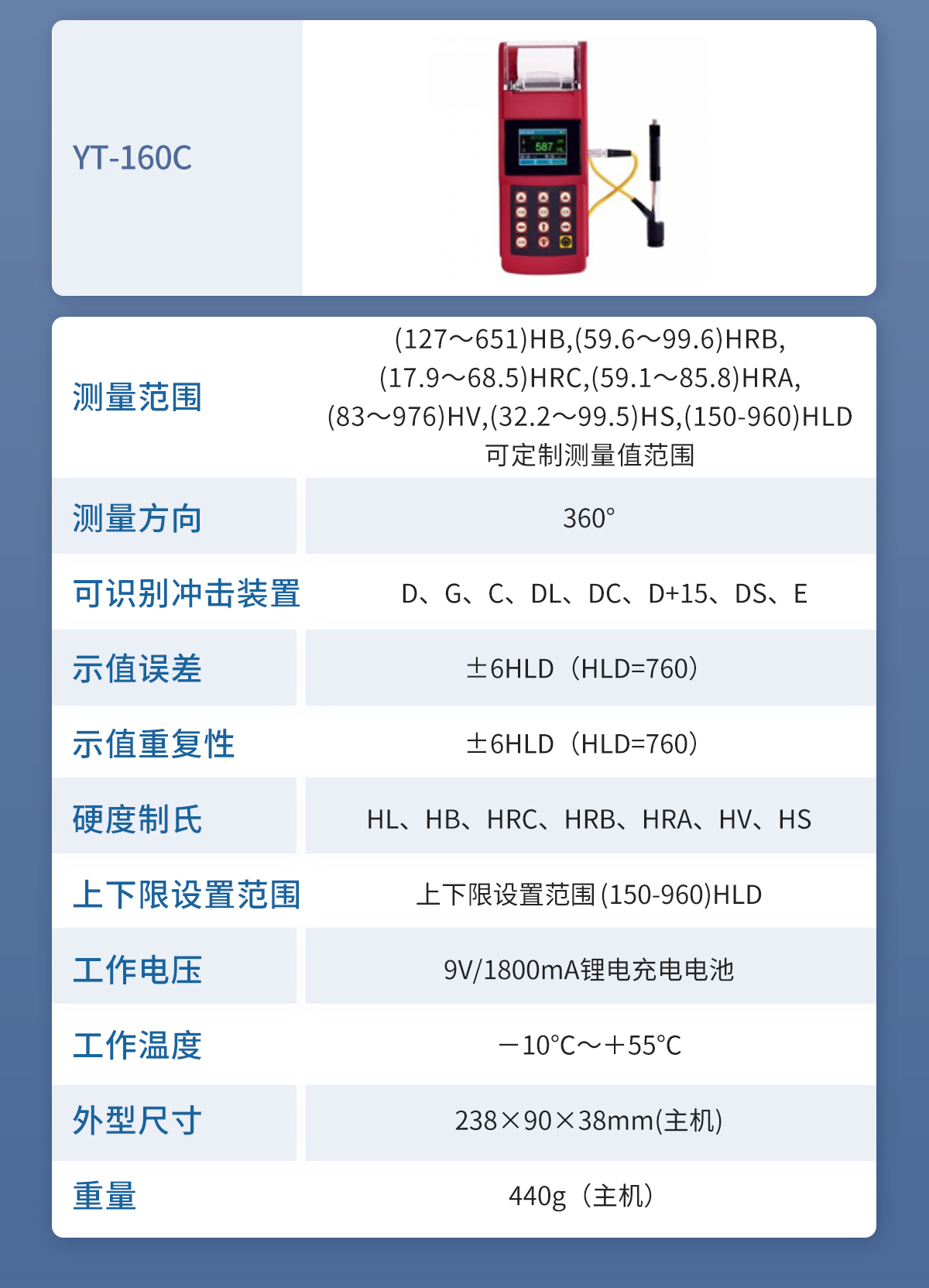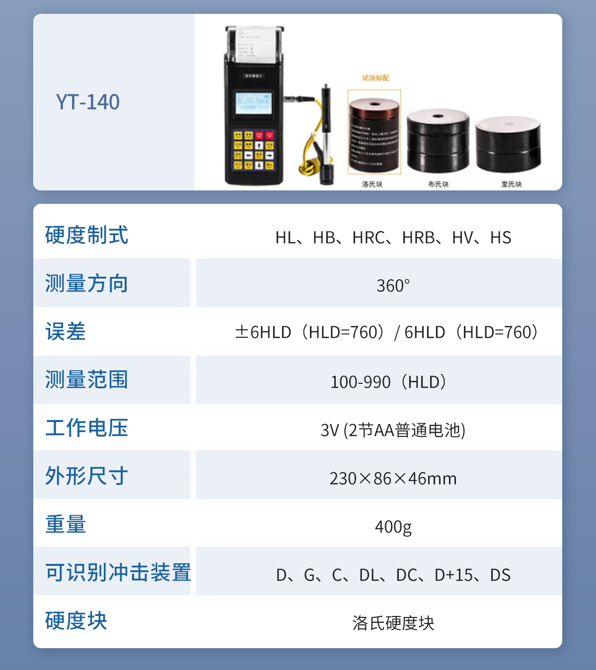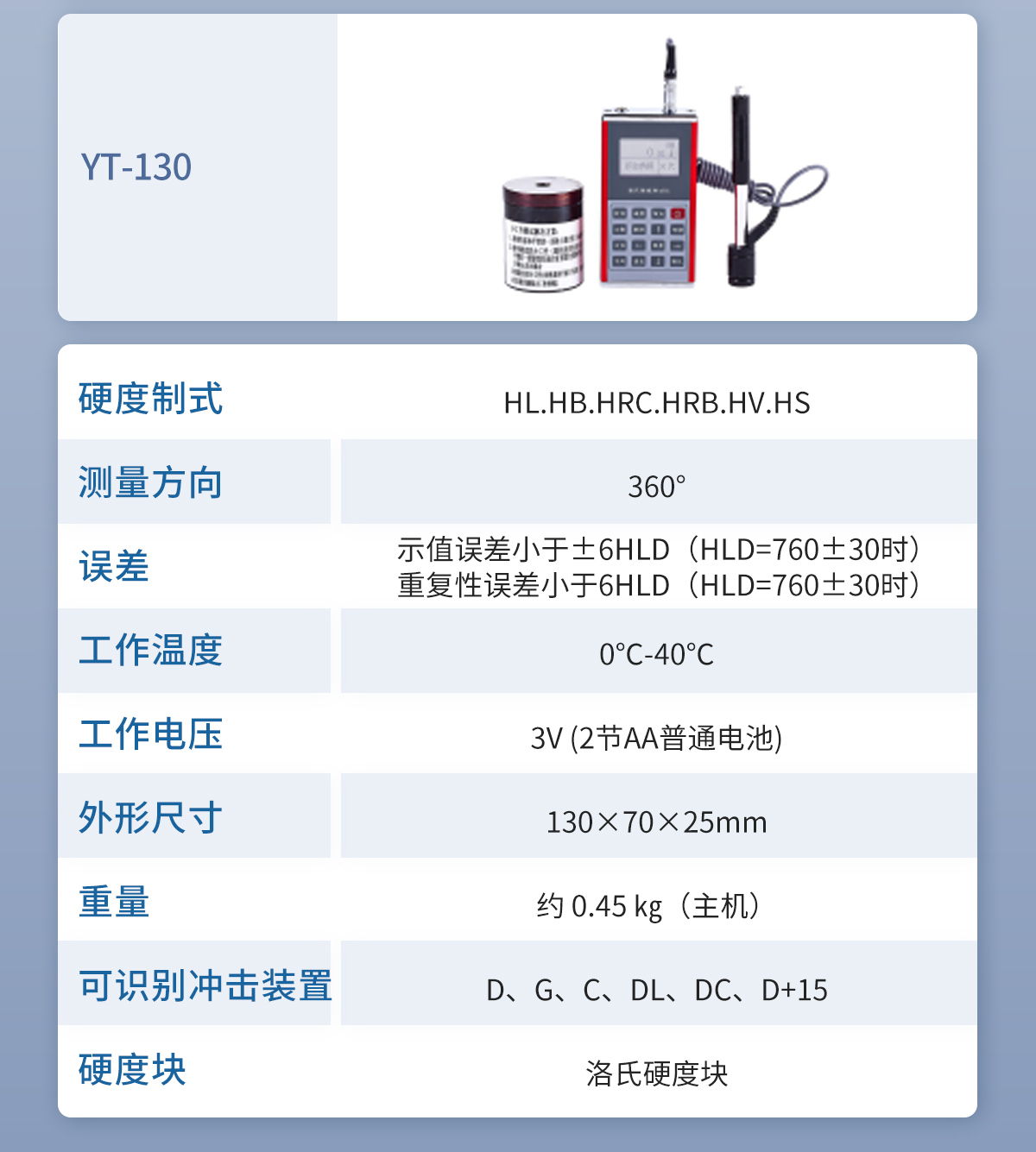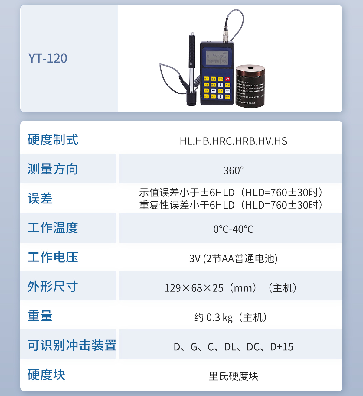 YT-120 里氏硬度计是我公司生产的多功能的硬度测量仪器。使用全中文显示,菜单式操作,操作简单、方便。本机可直接;显示里氏、布氏、洛氏、维氏、肖氏等各种硬度值。仪器小巧、便携、可靠性高,适用于恶劣的操作环境,抗振动、冲击和电磁干扰。