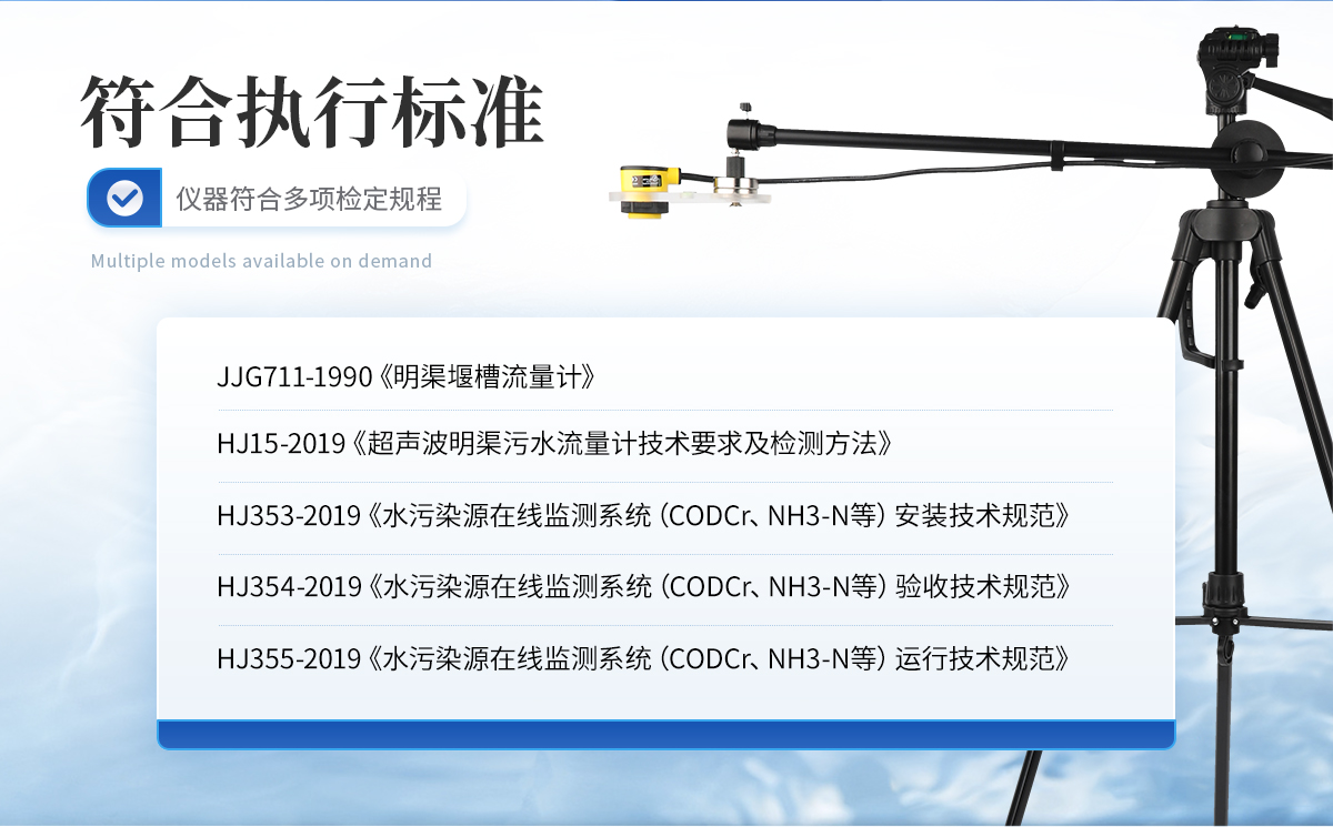 JJG711-1990《明渠堰槽流量计》; HJ15-2019《超声波明渠污水流量计技术要求及检测方法》; HJ353-2019《水污染源在线监测系统(CODCr、NH3-N等)安装技术规范》; HJ354-2019《水污染源在线监测系统(CODCr、NH3-N等)验收技术规范》; HJ355-2019《水污染源在线监测系统(CODCr、NH3-N等)运行技术规范》;