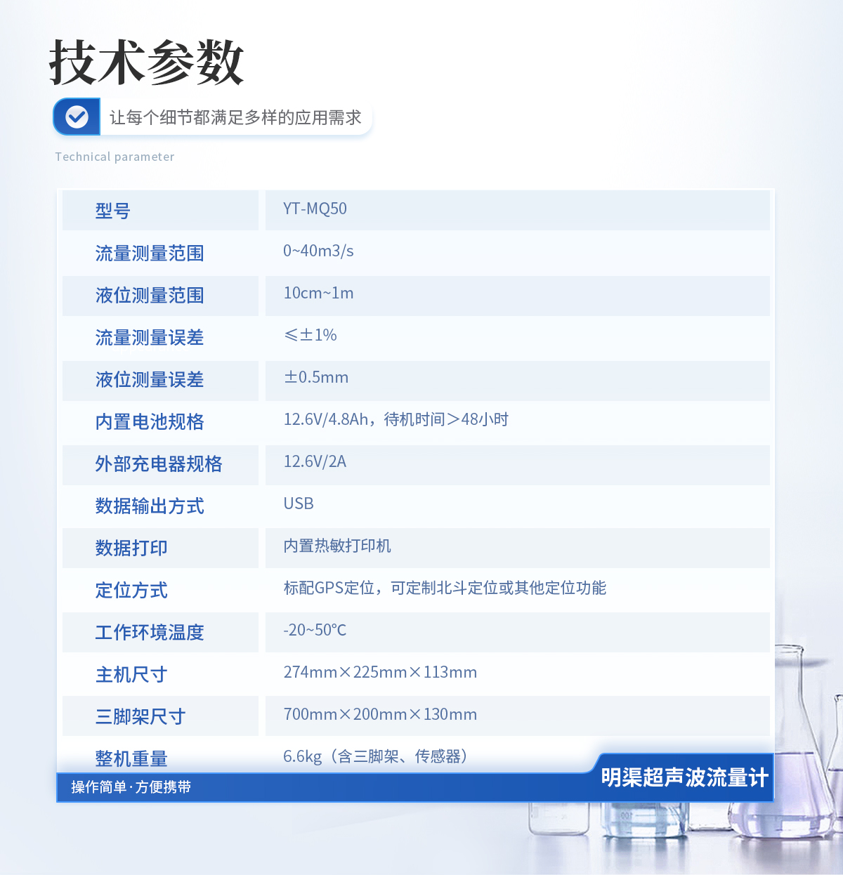1.流量测量范围:0~40m3/s; 2.液位测量范围:10cm~1m; 3.流量测量误差:≤±1%; 4.液位测量误差:±0.5mm; 5.内置电池规格:12.6V/4.8Ah,待机时间>48小时; 6.外部充电器规格:12.6V/2A; 7.数据输出方式:USB; 8.数据打印:内置热敏打印机; 9.定位方式:标配GPS定位; 10.工作环境温度:-20~50℃ 11.主机尺寸:274*225*113mm; 12.三脚架尺寸:700*200*130mm; 13.整机重量:6.6kg(含三脚架、传感器);