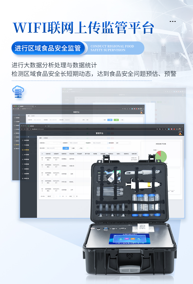 4、仪器带有监管平台,数据可局域网和互联网数据上传,检测结果直接传至食品安全监管平台。进行区域食品安全监管及大数据分析处理与数据统计,检测区域食品安全长短期动态,达到食品安全问题预估、预警