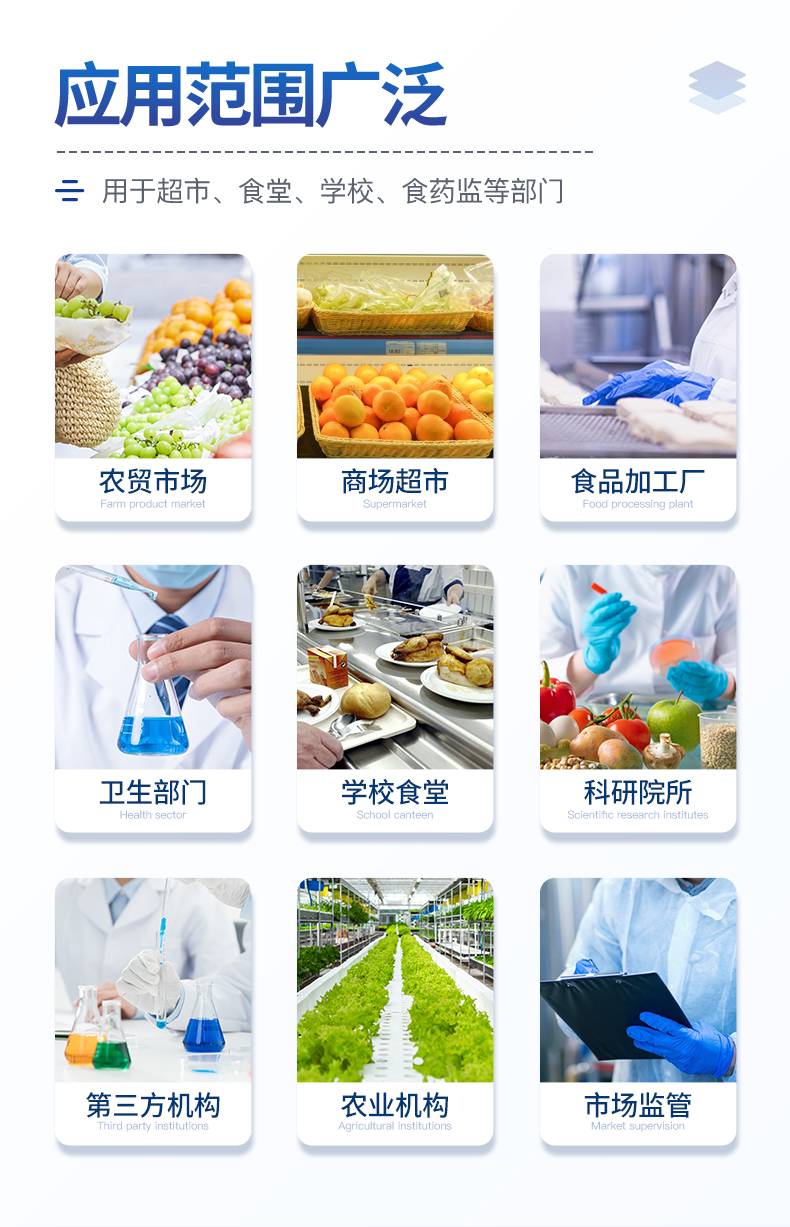 广泛应用于主要用于蔬菜、水果、茶叶、粮食、农副产品等食品中有机磷和氨基甲酸酯类农药残留的快速检测;此外还可用于果蔬茶生产基地和农贸批发销售市场现场检测,餐馆、学校、食堂、家庭果蔬加工前的安全速测等。