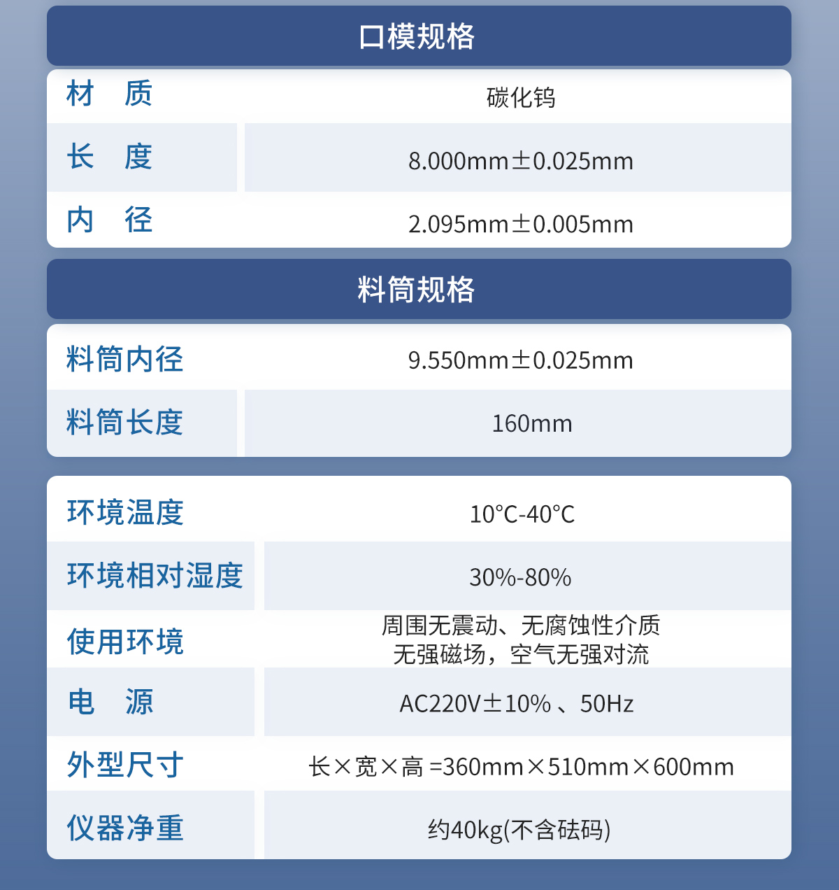 附件:工具箱一个,纱布一卷,口模一个,压料杆(清洁杆)一支、口模通孔器一支.漏斗一个.夹子一把.砝码一套.
