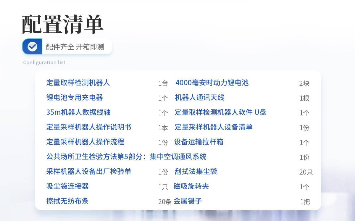 | 定量取样检测机器人:1台 | 4000毫安时动力锂电池:2块 | 锂电池专用充电器:1个 | 机器人通讯天线:1根 | 35m机器人数据线轴:1个 | 定量取样检测机器人软件 U盘:1个 | 定量采样机器人操作说明书:1本 | 定量采样机器人设备清单:1份 | 定量采样机器人操作流程:1份 | 公共场所卫生检验方法第5部分:集中空调通风系统:1份 | 采样机器人设备出厂检验单:1份 | 刮拭法集尘袋 :20只 | 吸尘袋连接器 :1只 | 磁吸旋转夹:1个 | 擦拭无纺布条 :20条 | 金属镊子:1把 | 设备运输拉杆箱:1个 |