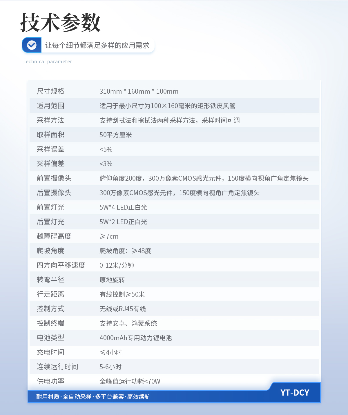 | 合规性:完全符合《WS 10013-2023》、《WS/T 10004-2023》及《GB 37488-2019》中对集中空调定量采样机器人的要求。 | 紧凑设计:尺寸长宽高310mm * 160mm * 100mm,可进入*小尺寸为100×160毫米的矩形铁皮风管内部进行采样。 | 精准采样:提供刮拭法和擦拭法两种采样方法,采样器取样面积50平方厘米,密闭双采样器加装气流回风道,并使用光固化3D打印技术制造,保障了采样面积的有效性。布条和拥有专利设计的刮板夹安装方便快捷,现场操作时可**限度地杜绝二次污染,实现无菌操作。采样误差小于5%,采样偏差小于3%。 | 全方位视野:前置摄像头俯仰角度达200度,前后均采用150度广角定焦摄像头,提供无死角视野。 | 灵活控制:支持无线与有线两种控制方式,有线控制距离≥50米,无线控制无距离限制。视频采集、拍照及机器人控制均由终端完成。 | 强大越障能力:越障碍高度≥7cm,爬坡角度≥48度,整机含电池工作重量仅为4.0KG。 | 全自动采样:软件控制加入了《集尘量采样》与《微生物采样》的全自动一键采样功能,无需人工干预即可完成所有采样动作。 | 耐用材质:整机不低于95%的材料使用航空铝合金,表面经过氧化喷砂处理并增厚钝化膜,增加表面硬度。机体行走模块一体成型,总重不超过4KG。 | 多平台兼容:支持安卓系统、鸿蒙系统的手机、平板、电脑进行控制操作。 | **续航:配备4000mAh容量的动力电池,充电时间≤4小时,单次充电后可持续运行约5-6小时。 |