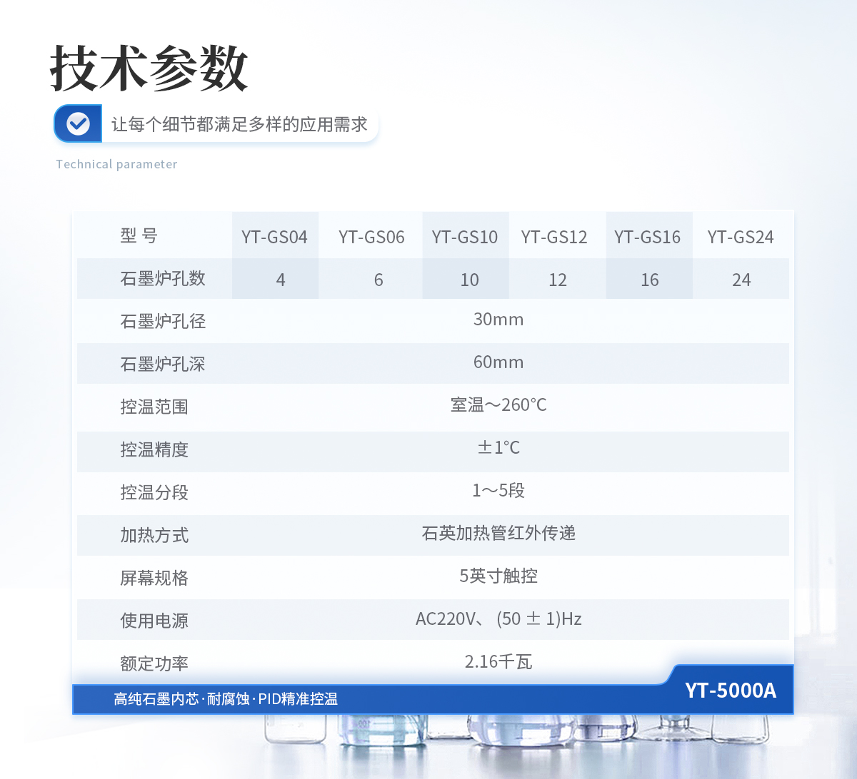 石墨炉孔:孔径30mm,孔深60mm,孔数4×4 控温范围:室温~260℃ 控温精度:±1℃ 控温分段:1~5段 加热方式:石英加热管红外传递 屏幕规格:5寸触控 主机外型尺寸:宽477mm×深460mm×高168mm 使用电源:AC220V、 (50 ± 1)Hz 额定功率:2.16千瓦