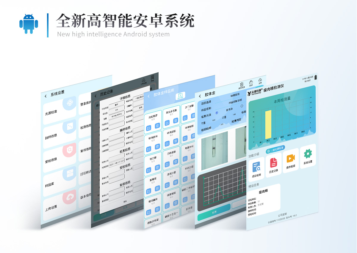 | 1、仪器采用10.1英寸液晶触摸屏显,搭配运行安卓智能操作系统,主控芯片采用ARM Cortex-A7,RK3288/4核处理器,主频1.88Ghz,运转速度更快速,性能更强。 | 2、仪器功能包括:胶体金检测模块、数字化管理模块、无线通讯模块等,可以满足同一软件下实现所有检测项目的检测,并在同一窗口展示检测结果。 | 3.一体化便携式快检设备,采用交直流两用供电方式,可连接车载电源,配备6ah大容量充电锂电池,可以满足现场及流动检测使用的需求。仪器尺寸:43×35×20cm, 主机净重:5.1kg | 4、系统自带数据集成模块,设备首页自动统计检测数据包含:周检测数据、月检测数据,全部检测总数量,均包含检测总数,合格数,不合格数,以及相关柱形分析图,对各项检测数据清晰掌握,无需电脑查询,更加快捷直观。 | 5、仪器具有任务预设模块,可在样品送检前提前预设样品名称、检测指标、送检单位等信息,样品送检时一键调取保存信息,检测更加方便快捷。 | 6、胶体金检测模块: | 直插式自动扫描方式,可实时显示金标卡实时图像,系统自动分析并呈现出CT曲线图,CT线自动识别,无需手动调整,完成检测后自动退出检测卡。 | 结果判定线可修改,对照值标定值可保存,断电不丢失数据。 | 兼容市场上其他胶体金卡,使用耗材不受限制,极大增强用户使用体验。 | 7、仪器检测系统拥有庞大数据库,并且构建了完善的检索、修订功能。食品库涵盖多种样品名称,可按需添加或删除、编辑样品名称;产品数据库以及历史检测记录支持一键检索功能。 | 8、系统打印自定义化,打印格式多样化,产品合格证(国家标准要求),二维码,抽样信息、检测信息,受检信息、复核信息、抽样日期、检测日期等信息结果,可按需求自行设置打印内容。 | 9、A4纸版本报告打印功能(可选配):设备拥有两种结果展示方式,可以自动生成A4打印模板和小票打印模板两种样式,可通过WiFi及网线等方式链接外置打印机可进行打印 | 10、仪器具有 wifi 联网上传、RJ45网线连接功能,可以快速上传数据。同步对接监管平台,数据可局域网和互联网数据上传,检测结果直接传至食品安全监管平台。进行区域食品安全监管及大数据分析处理与数据统计,检测区域食品安全长短期动态,达到食品安全问题预估、预警。 | 11、设备支持U盘存储,标准USB接口,免驱动安装。检测结果存储容量20万条以上,可生成Excel表格,进行一键拷贝,并具有登录保护功能,可设置用户名及密码,规范不同人员操作权限,防止非工作人员操作,并且可以进行重新校准、锁定、恢复出厂设置功能。仪器固件可升级,后期检测项目可扩充。 | 12、仪器具备远程升级功能,可定向分客户分仪器更新,开机后自动更新,并可持续性免费更新系统版本,无需像传统产品返厂更新,节省时间及人力成本并避免了物流运输返厂升级导致设备损坏的潜在风险。 |