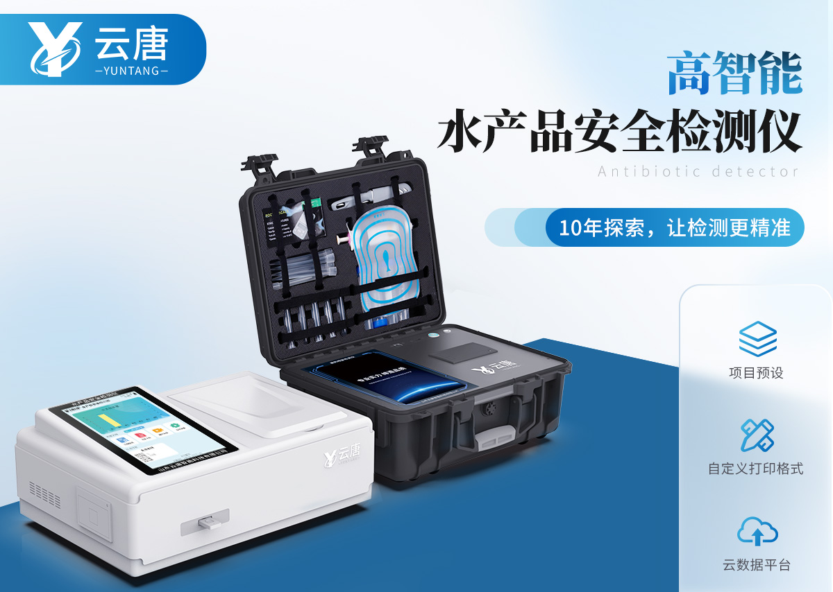 山东云唐智能科技有限公司生产的水产品安全检测仪可适用于鱼、虾等水产中孔雀石绿、氯霉素、硝基呋喃类:呋喃唑酮(AOZ)、呋喃它酮( AMOZ )、呋喃妥因(AHD)、呋喃西林(SEM)、呋喃那斯、磺胺类、激素类、四环素类、金霉素、土霉素、甲砜霉素、氟苯尼考、喹诺酮类药物:噁喹酸、诺氟沙星、恩诺沙星、环丙沙星、氧氟沙星等药物残留的定性检测