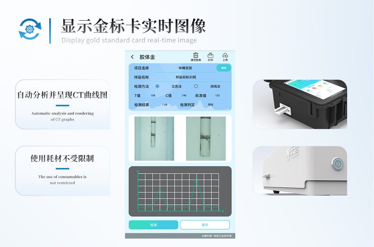 | 1、仪器采用10.1英寸液晶触摸屏显,搭配运行安卓智能操作系统,主控芯片采用ARM Cortex-A7,RK3288/4核处理器,主频1.88Ghz,运转速度更快速,性能更强。 | 2、仪器功能包括:胶体金检测模块、数字化管理模块、无线通讯模块等,可以满足同一软件下实现所有检测项目的检测,并在同一窗口展示检测结果。 | 3.一体化便携式快检设备,采用交直流两用供电方式,可连接车载电源,配备6ah大容量充电锂电池,可以满足现场及流动检测使用的需求。仪器尺寸:43×35×20cm, 主机净重:5.1kg | 4、系统自带数据集成模块,设备首页自动统计检测数据包含:周检测数据、月检测数据,全部检测总数量,均包含检测总数,合格数,不合格数,以及相关柱形分析图,对各项检测数据清晰掌握,无需电脑查询,更加快捷直观。 | 5、仪器具有任务预设模块,可在样品送检前提前预设样品名称、检测指标、送检单位等信息,样品送检时一键调取保存信息,检测更加方便快捷。 | 6、胶体金检测模块: | 轨道式自动传输扫描方式,可实时显示金标卡实时图像,系统自动分析并呈现出CT曲线图,CT线自动识别,无需手动调整,完成检测后自动退出检测卡。 | 结果判定线可修改,对照值标定值可保存,断电不丢失数据。 | 兼容市场上其他胶体金卡,使用耗材不受限制,极大增强用户使用体验。 | 7、仪器检测系统拥有庞大数据库,并且构建了完善的检索、修订功能。食品库涵盖多种样品名称,可按需添加或删除、编辑样品名称;产品数据库以及历史检测记录支持一键检索功能。 | 8、系统打印自定义化,打印格式多样化,产品合格证(国家标准要求),二维码,抽样信息、检测信息,受检信息、复核信息、抽样日期、检测日期等信息结果,可按需求自行设置打印内容。 | 9、A4纸版本报告打印功能(可选配):设备拥有两种结果展示方式,可以自动生成A4打印模板和小票打印模板两种样式,可通过WiFi及网线等方式链接外置打印机可进行打印 | 10、仪器具有 wifi 联网上传、RJ45网线连接功能,可以快速上传数据。同步对接监管平台,数据可局域网和互联网数据上传,检测结果直接传至食品安全监管平台。进行区域食品安全监管及大数据分析处理与数据统计,检测区域食品安全长短期动态,达到食品安全问题预估、预警。 | 11、设备支持U盘存储,标准USB接口,免驱动安装。检测结果存储容量20万条以上,可生成Excel表格,进行一键拷贝,并具有登录保护功能,可设置用户名及密码,规范不同人员操作权限,防止非工作人员操作,并且可以进行重新校准、锁定、恢复出厂设置功能。仪器固件可升级,后期检测项目可扩充。 | 12、仪器具备远程升级功能,可定向分客户分仪器更新,开机后自动更新,并可持续性免费更新系统版本,无需像传统产品返厂更新,节省时间及人力成本并避免了物流运输返厂升级导致设备损坏的潜在风险。 |