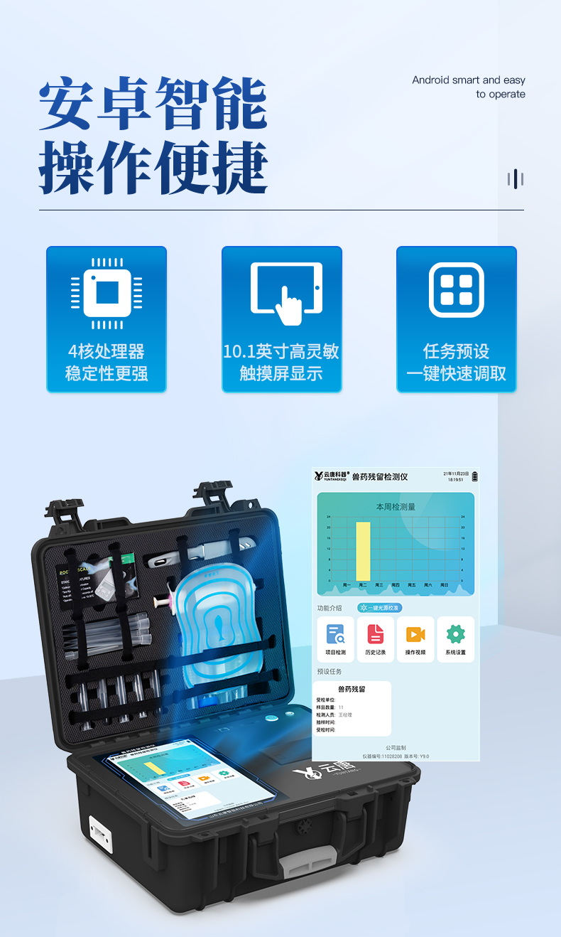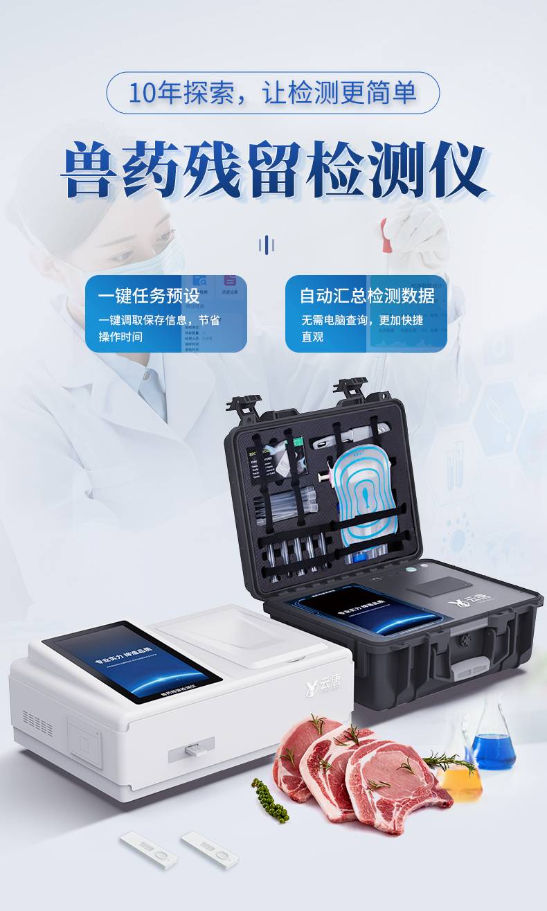 山东云唐智能科技有限公司生产的高智能兽药残留检测仪可快速检测瘦肉精激素类食品安全项目,包含盐酸克伦特罗、沙丁胺醇、莱克多巴胺、己烯雌酚,兽药残留、抗生素类残留、真菌毒素类残留、动物疫病类等检测。