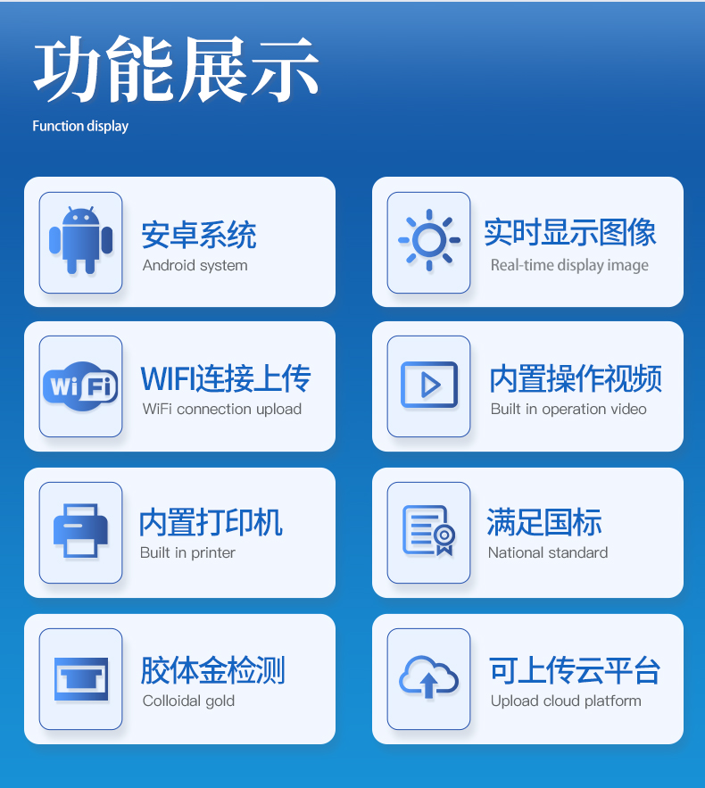 2、仪器功能包括:胶体金检测模块、数字化管理模块、无线通讯模块等,可以满足同一软件下实现所有检测项目的检测,并在同一窗口展示检测结果。