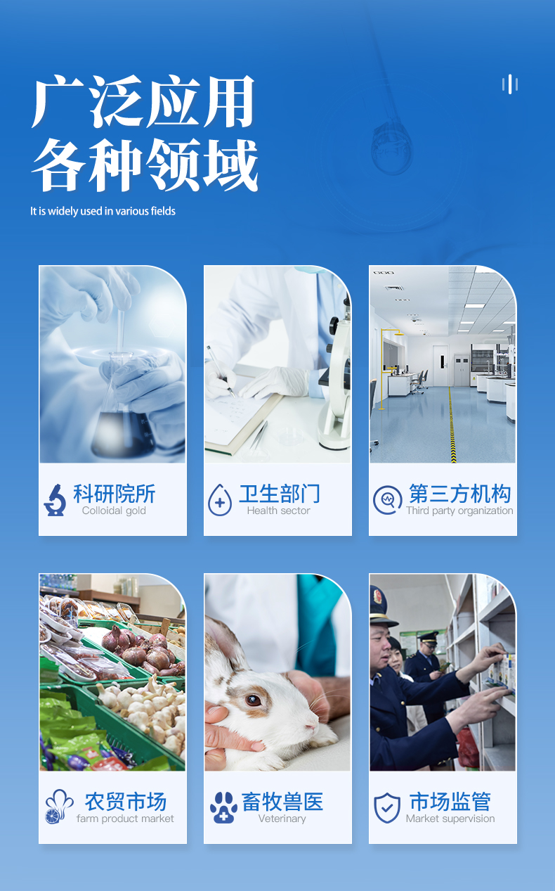 该高智能兽药残留检测仪为集成化食品安全快速检测分析设备,目前已于食药监局、卫生部门、高教院校、科研院所、农业部门、养殖场、屠宰场、食品肉产品深加工企业及检验检疫部门等单位广泛使用。