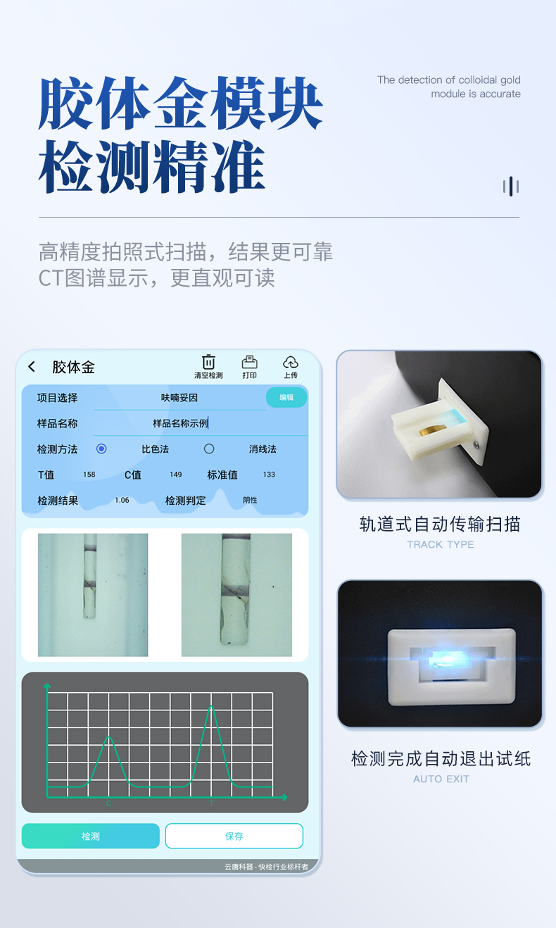 直插式自动扫描方式,可实时显示金标卡实时图像,系统自动分析并呈现出CT曲线图,CT线自动识别,无需手动调整,完成检测后自动退出检测卡。