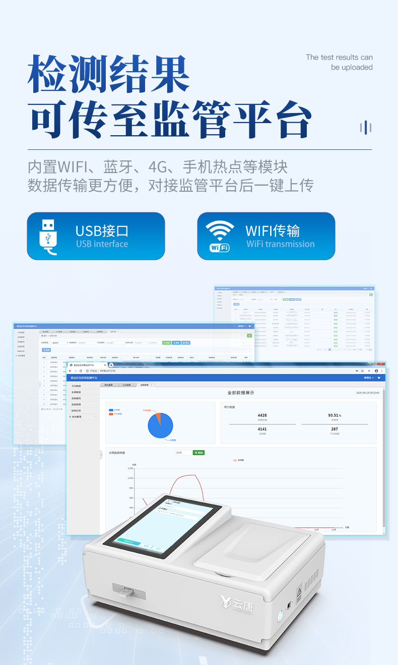 10、仪器具有 wifi 联网上传、RJ45网线连接功能,可以快速上传数据。同步对接监管平台,数据可局域网和互联网数据上传,检测结果直接传至食品安全监管平台。进行区域食品安全监管及大数据分析处理与数据统计,检测区域食品安全长短期动态,达到食品安全问题预估、预警。