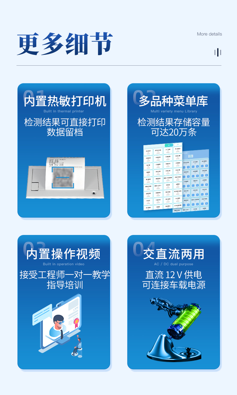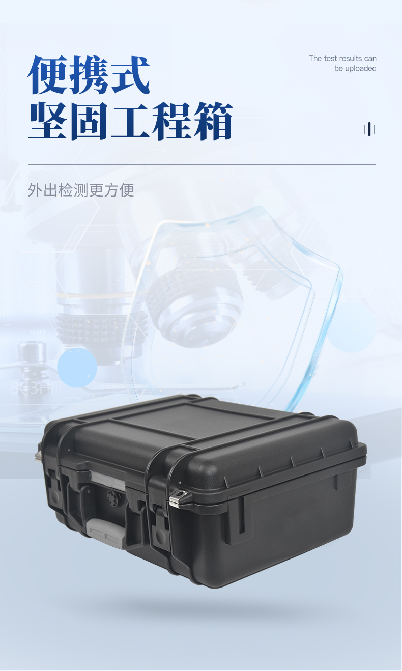 3.一体化台式快检设备,采用交直流两用供电方式,可连接车载电源,配备6ah大容量充电锂电池,可以满足现场及流动检测使用的需求。仪器尺寸:43×35×20cm, 主机净重:5.1kg