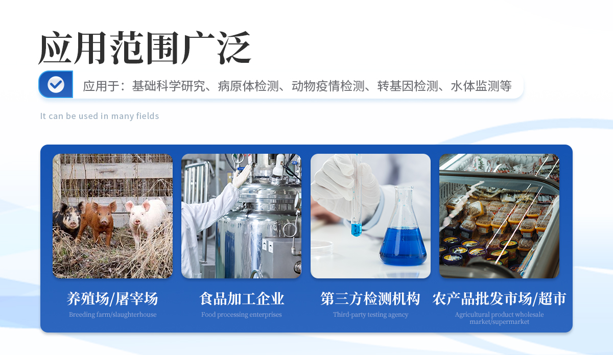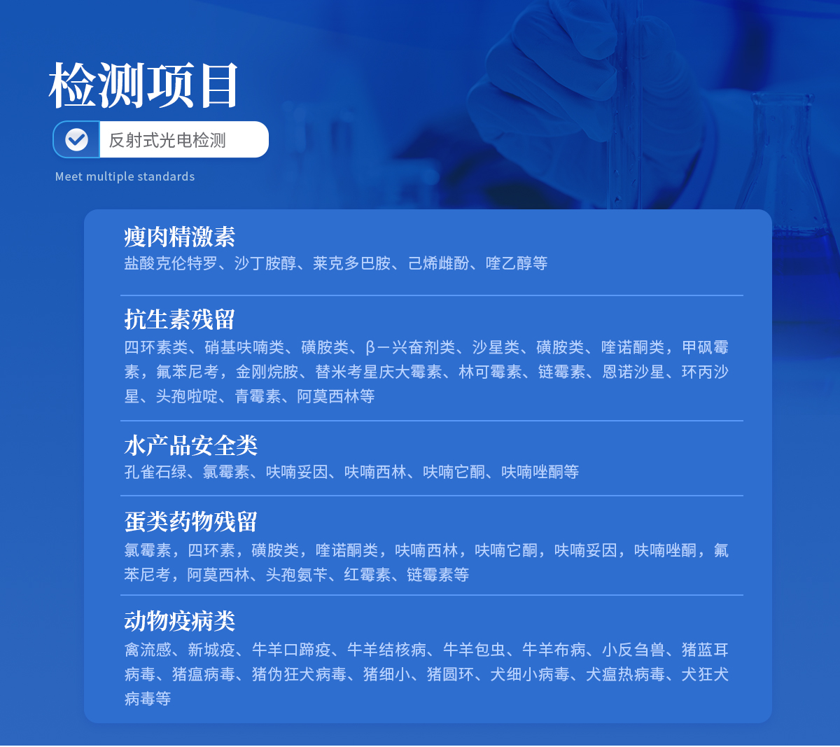 | 1、 瘦肉精激素:盐酸克伦特罗、沙丁胺醇、莱克多巴胺、己烯雌酚、喹乙醇等 | 2、 抗生素残留:四环素类、硝基呋喃类、磺胺类、β-兴奋剂类、沙星类、磺胺类、喹诺酮类,甲砜霉素,氟苯尼考,金刚烷胺、替米考星、庆大霉素、林可霉素、链霉素、恩诺沙星、环丙沙星、头孢啦啶、青霉素、阿莫西林等 | 3、 水产品安全类:孔雀石绿、氯霉素、呋喃妥因、呋喃西林、呋喃它酮、呋喃唑酮等 | 4、 蛋类药物残留 氯霉素,四环素,磺胺类,喹诺酮类,呋喃西林,呋喃它酮,呋喃妥因,呋喃唑酮,氟苯尼考,阿莫西林、头孢氨苄、红霉素、链霉素等 | 5、 动物疫病类:禽流感、新城疫、牛羊口蹄疫、牛羊结核病、牛羊包虫、牛羊布病、小反刍兽、猪蓝耳病毒、猪瘟病毒、猪伪狂犬病毒、猪细小、猪圆环、犬细小病毒、犬瘟热病毒、犬狂犬病毒等 |