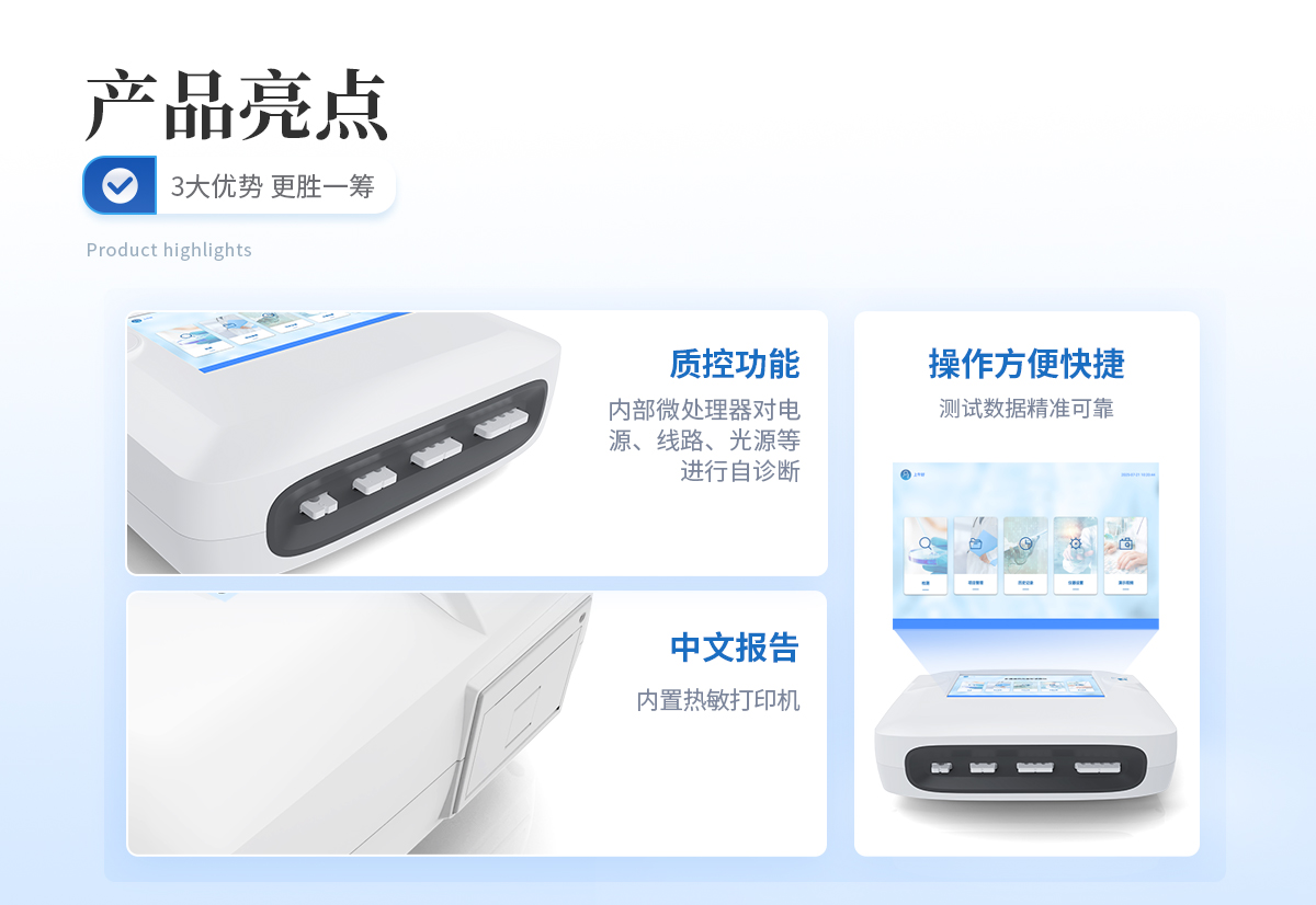| 1、 Android触控系统结合大尺寸高清屏幕,界面友好,操作简单流畅,无需外接设备; | 2、 6通道可以同时检测不同项目,显著提升检测效率,满足批量样本快速处理需求; | 3、 二维码扫描录入样本信息,避免人工错误 | 4、 8G超大容量内存,支持按日期灵活查询、预览、删除结果,并生成多样化专业报告。 | 5、 内置热敏打印机,检测完成即可现场打印标准报告,提升工作效率。 | 6、 关键部件实时自诊断功能,保障仪器长期稳定运行。 | 7、 高速有线/无线网络及蓝牙,构建完善的数据监控平台,实现数据实时上传、远程查询、统计分析和监管协同。 | 8、 丰富的接口设计,轻松连接电脑、U盘、网络及上位机系统,支持U盘导出。 | 9、 孵育模块为特定试纸条反应提供**温度环境。 | 10、 流线型结构,紧凑轻便,兼顾实验室耐用性与检测需求。 | 11、 插卡判断:检测卡未插入检测通道不能检测 | 12、 内置质控功能,可设备送检、设备自检、试剂卡自检 | 13、 检测方式:孵育检测、即时检测(对检测数据复检核实) | 14、 检测曲线:可以对试剂卡的检测核验,防止误判 | 15、 检测结果:报告出检测项目、被测物质的浓度、检测单位、被检查单位、检验员、检测时间、检测限等信息可在触摸屏上显示,可通过仪器内置打印机输出 | 16、 项目管理:支持检测项目拓展功能 | 17、 界面设置:可修改标题和页尾信息,灵活展示仪器信息 |