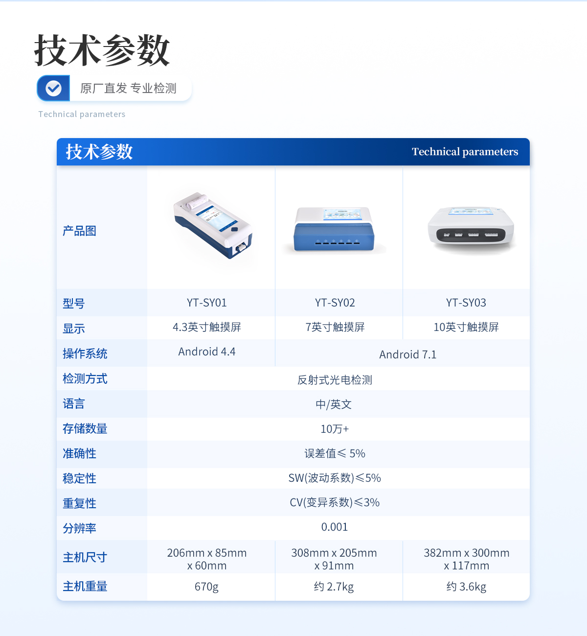 | 1、 7英寸电容式触摸屏,分辨率:1920:x:1200,内部存储:1+8GB | 2、 操作系统:Android:7.1 | 3、 检测方式:反射式光电检测 | 4、 适配卡壳:70mm*20mm | 5、 语言:中/英文: | 6、 存储数量:10万+ | 7、 准确性:误差值≤:5% | 8、 稳定性:SW(波动系数)≤5% | 9、 重复性:CV(变异系数)≤3% | 10、分辨率:0.001 | 11、检测通道:6通道检测 | 12、检测时间:<5秒(单卡及多联卡);可对样本进行胶体金定性/半定量检测。 | 13、数据传输:WiFi、蓝牙、USB、射频读卡、外置扫码模块(选配) | 14、数据处理:可通过通讯端口进行数据汇总、上传监管平台等 | 15、检测通道孵育检测一体,温度范围::室温:+5℃:~:60℃ | 16、打印机:热敏打印机(热敏打印纸:57*20mm) | 17、接口:USB接口:2个;USB-B接口:1个;LAN接口:1个:;DC电源接口:5.5/2.1mm | 18、电源:输入:AC100V-240V/1.3A 50Hz;输出:DC12V/5A | 19、使用环境:温度:0~50℃;湿度:0~90%: | 20、主机尺寸::308mm*205mm*91mm | 21、主机重量:约:2.7kg |