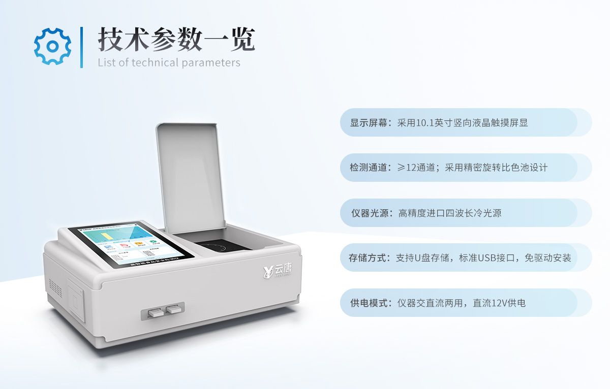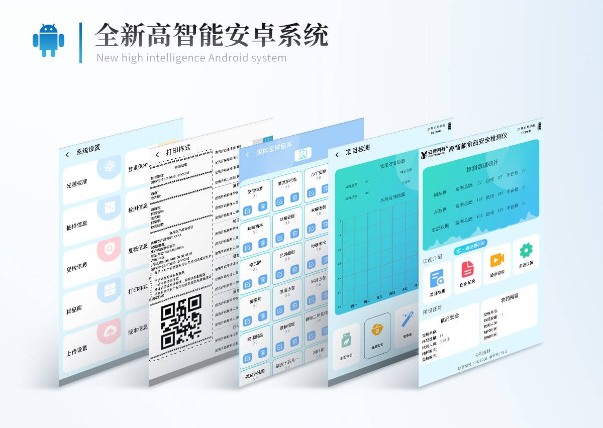 | 仪器采用台式一体化系统检测技术,将分光光度模块、胶体金检测模块、新型农残检测模块、数字化管理模块、无线通讯模块高度集成于一体,支持检测200种食品安全检测项目,同时预留升级检测方法。 | 仪器检测模块标准化、智能化,可随意自由组合。检测箱体内置多个标准检测单元,检测模块可以调整配置。 | 显示屏幕:仪器采用10.1英寸竖向液晶触摸屏显,搭配运行安卓智能操作系统,主控芯片采用ARM Cortex-A7,RK3288/4核处理器,主频1.88Ghz,操作方便,性能更强。 | 检测通道≥12通道;采用精密旋转比色池设计,使用同芯片同光源校准精度,解决不同光源之间的误差值。1-12通道间误差0.1%。(***:**202022821055.2) | 仪器光源:高精度进口四波长冷光源,每个通道均配置 410、520、590、630nm 波长光源,标配**的光路切换装置,专利光路切换功能可实现64波长,并且所有检测项目可实现所有通道同时检测。 | 设备可一键校准,自动保存校准数据,自动对比校验,得到精准光源,采用Android SP存储数据,光源数据永不丢失,方便每一次使用。 | 通讯接口: 配备无线通信模块、可选配4G(APN)通讯模块和蓝牙传输,同时具有双USB接口以及RJ45网线接口,可以多方式实现数据保存及数据传输。 | 存储方式: 支持U盘存储,标准USB接口,免驱动安装。检测结果存储容量20万条以上,可生成Excel表格进行拷贝,并具有登录保护功能。 | 智能化操作系统: | 操作系统:仪器可在同一检测界面自动对应相关检测通道,一次性选择1-12个样品名称,无需退出界面,节省操作时间。并可以对每个通道属性和样品信息单独进行编辑,例如送检单位、人员,检测人员等,打印时勾选打印显示。 | 数据集成系统:设备首页自动汇总分析检测数据,包含:周检测数据、月检测数据,全部检测总数量,均包含检测总数,合格数,不合格数,以及相关柱形分析图,各项检测数据一目了然,无需电脑查询,更加快捷直观。 | 数据库系统:十几项数据库分类管理仪器:包含项目类型、项目数据、检测数据、历史记录、国标信息、曲线信息、采样信息、检测信息、受检信息、复核信息、图表信息、光源校准信息、打印样式信息、样品库信息等等,数据库之间互相协调联动保证数据的真实完整性。同时产品数据库以及历史检测记录支持一键检索功能。 | 限量规判系统:具有限量查询、添加物质合规判定系统。检测出结果后,系统自动调用系统数据库中相关国标进行比对判定,客观显示判定结果是否合格。 | 项目预设系统:仪器具有任务预设模块,一键提前预设,给出方便快捷的新检测方案,每一个任务分别可以设置不同的样品、批次、编号、来源、备注、抽样信息、检测信息、受检信息、复核信息等更多信息。样品送检时一键调取保存信息,并可多次调取,大大提高检测效率。 | 数据监管系统:同步对接监管平台,数据可局域网和互联网数据上传,检测结果可选择直接传至食品安全监管平台。进行区域食品安全监管及大数据分析处理与数据统计,检测区域食品安全长短期动态,达到食品安全问题预估、预警。 | 打印系统:内置全新打印机,新创自定义打印方式,可按需灵活勾选控制:产品合格证(国家农业部标准要求),二维码,抽样信息、检测信息,受检信息、复核信息、抽样日期、检测日期等信息的打印。 | 供电模式:仪器交直流两用,直流12V供电,可连接车载电源,可配6ah大容量充电锂电池,电量可实时显示,方便户外流动测试。 | 设备尺寸:(长*宽*高)440*300*180mm | 仪器加入远程升级功能,可定向分客户分仪器更新,开机后自动更新,客户无需任何操作,即可升级全新项目。做到了无需退换机器即可实现实时远程升级检测仪器。 |