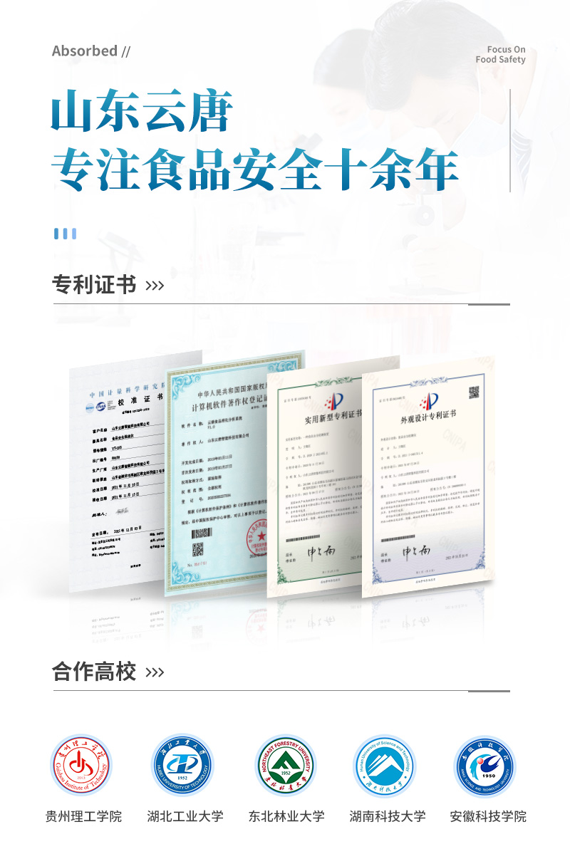 | 仪器采用台式一体化系统检测技术,将分光光度模块、胶体金检测模块、新型农残检测模块、数字化管理模块、无线通讯模块高度集成于一体,支持检测200种食品安全检测项目,同时预留升级检测方法。 | 仪器检测模块标准化、智能化,检测项目可随意自由组合。检测台式体内置多个标准检测单元,检测模块可以调整配置。 | 显示屏幕:仪器采用10.1英寸竖向液晶触摸屏显,搭配运行安卓智能操作系统,主控芯片采用ARM Cortex-A7,RK3288/4核处理器,主频1.88Ghz,操作方便,性能更强。 | 检测通道:≥12通道;采用精密旋转比色池设计,使用同芯片同光源校准精度,解决不同光源之间的误差值,更加准确**。(1-12通道间误差0.1%,***:**202022821055.2) | 仪器光源:高精度进口四波长冷光源,每个通道均配置 410、520、590、630nm 波长光源,标配**的光路切换装置,专利光路切换功能可实现64波长,并且所有检测项目可实现所有通道同时检测。 | 设备可一键校准,自动保存校准数据,自动对比校验,得到精准光源,采用Android SP存储数据,光源数据永不丢失,方便每一次使用。 | 通讯接口:配备无线通信模块、4G(APN)通讯模块、蓝牙传输,同时具有双USB接口以及RJ45网线接口,可以多方式实现数据保存及数据传输。 | 存储方式:支持U盘存储,标准USB接口,免驱动安装。检测结果存储容量20万条以上,可生成Excel表格进行拷贝,并具有登录保护功能。 | 操作系统:仪器可在同一检测界面自动对应相关检测通道,一次性选择1-12个样品名称,无需退出界面,节省操作时间。并可以对每个通道属性和样品信息单独进行编辑,例如送检单位、人员,检测人员等,打印时勾选打印显示。 | 数据集成系统:设备首页自动汇总分析检测数据,包含:周检测数据、月检测数据,全部检测总数量,包含检测总数,合格数,不合格数,以及相关柱形分析图,各项检测数据一目了然,无需电脑查询,更加快捷直观。 | 数据库系统:十几项数据库分类管理仪器:包含项目类型、项目数据、检测数据、历史记录、国标信息、曲线信息、采样信息、检测信息、受检信息、复核信息、图表信息、光源校准信息、打印样式信息、样品库信息等等,数据库之间互相协调联动保证数据的真实完整性。同时产品数据库以及历史检测记录支持一键检索功能。 | 限量规判系统:具有限量查询、添加物质合规判定系统。检测出结果后,系统自动调用系统数据库中相关国标进行比对判定,客观显示判定结果是否合格。 | 项目预设系统:仪器具有任务预设模块,一键提前预设,给出方便快捷的新检测方案,每一个任务分别可以设置不同的样品、批次、编号、来源、备注、抽样信息、检测信息、受检信息、复核信息等更多信息。样品送检时一键调取保存信息,并可多次调取,大大提高检测效率。 | 数据监管系统:同步对接监管平台,数据可局域网和互联网数据上传,检测结果可直接传至食品安全监管平台。进行区域食品安全监管及大数据分析处理与数据统计,监测区域食品安全长短期动态及问题预估、预警。 | 全新打印系统:内置全新打印机,新创自定义打印方式,可按需灵活勾选控制:产品合格证(国家农业部标准要求),二维码,抽样信息、检测信息,受检信息、复核信息、抽样日期、检测日期等信息的打印。 | A4纸版本报告打印功能(可选配):设备拥有两种结果展示方式,可以自动生成A4打印模板和小票打印模板两种样式,可通过WiFi及网线等方式链接外置打印机可进行打印。 | 供电模式:仪器交直流两用,直流12V供电,可连接车载电源,配6ah大容量充电锂电池,电量可实时显示,方便户外流动测试。 | 胶体金检测模块:采用CMOS成像处理技术及胶体金免疫层析技术,可读取胶体金卡数据,自动采集、处理分析,将检测结果显示,并可根据参考限值自动判断检测结果,可检测常见的兽药残留、生物毒素、抗生素、违禁添加物等。 | 探测技术:CMOS成像探测; | 检测通道:1个通道; | 检测方式:消线法和比色法; | 显示模式:阴性或阳性; | 曲线形式:轨道式扫描方式,显示金标卡图像,实时生成、识别CT曲线图,无需手动调整,完成检测后自动退出检测卡。兼容市场上其他金标卡,使用耗材不受限制。 | 仪器具备远程升级功能,可定向分客户分仪器更新,开机后自动更新,并可持续性免费更新系统版本,无需像传统产品返厂更新,节省时间及人力成本并避免了物流运输返厂升级导致设备损坏的潜在风险。 |