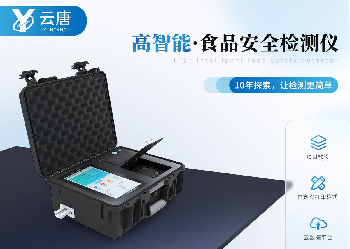 山东云唐智能科技有限公司生产的高智能食品安全检测仪为集成化食品安全快速检测分析设备,采用台式一体化设计,可快速检测200多种食品安全项目,包含非食用化学物质、滥用食品添加剂、农药残留、兽药残留、重金属、病害肉、营养强化剂、抗生素类残留、激素类残留、真菌毒素类残留、化学类残留等项目的定性定量检测。该高智能食品安全检测仪为集成化食品安全快速检测分析设备,目前已于食药监局、卫生部门、高教院校、科研院所、农业部门、养殖场、屠宰场、食品肉产品深加工企业及检验检疫部门等单位广泛使用。