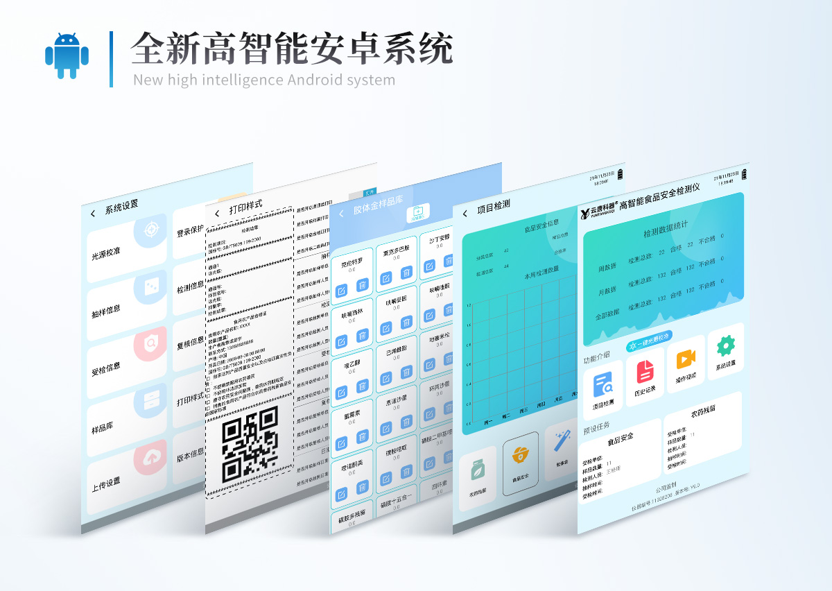 仪器采用手提式一体化系统检测技术,将分光光度模块、胶体金检测模块、新型农残检测模块、数字化管理模块、无线通讯模块高度集成于一体,支持检测200种食品安全检测项目,同时预留升级检测方法。仪器检测模块标准化、智能化,检测项目可随意自由组合。检测箱体内置多个标准检测单元,检测模块可以调整配置。 显示屏幕:仪器采用10.1英寸竖向液晶触摸屏显,搭配运行安卓智能操作系统,主控芯片采用ARM Cortex-A7,RK3288/4核处理器,主频1.88Ghz,操作方便,性能更强。检测通道:≥12通道;采用精密旋转比色池设计,使用同芯片同光源校准精度,解决不同光源之间的误差值,更加准确**。(1-12通道间误差0.1%,***:**202022821055.2)仪器光源:高精度进口四波长冷光源,每个通道均配置 410、520、590、630nm 波长光源,标配**的光路切换装置,专利光路切换功能可实现64波长,并且所有检测项目可实现所有通道同时检测。设备可一键校准,自动保存校准数据,自动对比校验,得到精准光源,采用Android SP存储数据,光源数据永不丢失,方便每一次使用。通讯接口:配备无线通信模块、4G(APN)通讯模块、蓝牙传输,同时具有双USB接口以及RJ45网线接口,可以多方式实现数据保存及数据传输。 存储方式:支持U盘存储,标准USB接口,免驱动安装。检测结果存储容量20万条以上,可生成Excel表格进行拷贝,并具有登录保护功能。智能化操作系统:: ★操作系统:仪器可在同一检测界面自动对应相关检测通道,一次性选择1-12个样品名称,无需退出界面,节省操作时间。并可以对每个通道属性和样品信息单独进行编辑,例如送检单位、人员,检测人员等,打印时勾选打印显示。★数据集成系统:设备首页自动汇总分析检测数据,包含:周检测数据、月检测数据,全部检测总数量,均包含检测总数,合格数,不合格数,以及相关柱形分析图,各项检测数据一目了然,无需电脑查询,更加快捷直观。★数据库系统:十几项数据库分类管理仪器:包含项目类型、项目数据、检测数据、历史记录、国标信息、曲线信息、采样信息、检测信息、受检信息、复核信息、图表信息、光源校准信息、打印样式信息、样品库信息等等,数据库之间互相协调联动保证数据的真实完整性。同时产品数据库以及历史检测记录支持一键检索功能。★限量规判系统:具有限量查询、添加物质合规判定系统。检测出结果后,系统自动调用系统数据库中相关国标进行比对判定,客观显示判定结果是否合格★项目预设系统:仪器具有任务预设模块,一键提前预设,给出方便快捷的新检测方案,每一个任务分别可以设置不同的样品、批次、编号、来源、备注、抽样信息、检测信息、受检信息、复核信息等更多信息。样品送检时一键调取保存信息,并可多次调取,大大提高检测效率。★数据监管系统:同步对接监管平台,数据可局域网和互联网数据上传,检测结果可选择直接传至食品安全监管平台。进行区域食品安全监管及大数据分析处理与数据统计,检测区域食品安全长短期动态,达到食品安全问题预估、预警。★打印系统:内置全新打印机,新创自定义打印方式,可按需灵活勾选控制:产品合格证(国家农业部标准要求),二维码,抽样信息、检测信息,受检信息、复核信息、抽样日期、检测日期等信息的打印。供电模式:仪器交直流两用,直流12V供电,可连接车载电源,可配6ah大容量充电锂电池,电量可实时显示,方便户外流动测试。胶体金检测模块:采用双通道CMOS成像处理技术及胶体金免疫层析技术,可同时读取双胶体金卡数据,自动采集、处理分析,将检测结果显示,并可根据参考限值自动判断检测结果,可检测常见的兽药残留、生物毒素、抗生素、违禁添加物等。★探测技术:CMOS成像探测;★检测通道:1个通道;★检测方式:消线法和比色法;★显示模式:阴性或阳性;★曲线形式:轨道式扫描方式,显示金标卡图像,实时生成、识别CT曲线图,无需手动调整,完成检测后自动退出检测卡。兼容市场上其他金标卡,使用耗材不受限制。仪器加入远程升级功能,可定向分客户分仪器更新,开机后自动更新,客户无需任何操作,即可升级全新项目。做到了无需退换机器即可实现实时远程升级检测仪器。