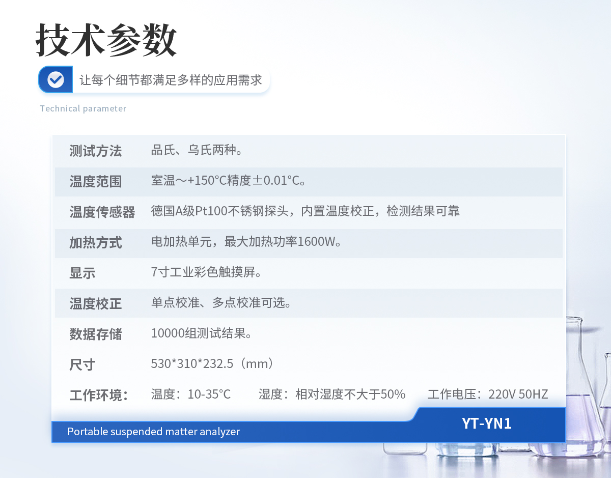 | 测试方法:品氏、乌氏两种。 | 温度范围:室温~+150°C精度±0.01°C。 | 温度传感器:德国A级Pt100不锈钢探头,内置温度校正,检测结果可靠。 | 加热方式:电加热单元,**加热功率1600W。 | 显示:7寸工业彩色触摸屏。 | 温度校正:单点校准、多点校准可选。 | 数据存储:10000组测试结果。 | 尺寸:530*310*232.5(mm) | 工作环境: | 温 度:10-35℃ | 湿 度:相对湿度不大于50% | 工作电压:220V 50HZ |