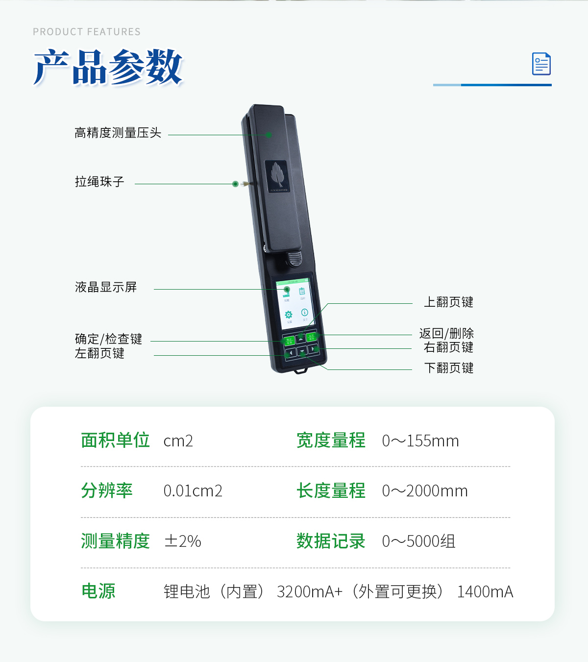 5)可存储5000组数据(叶面积、叶长、叶宽)。