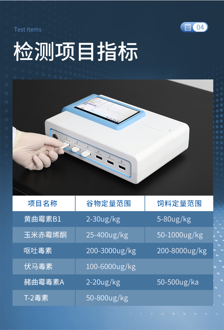 YT-L03P型真菌毒素快速检测仪采用荧光定量快速检测原理,主要检测粮油谷物及饲料中真菌毒素和重金属含量,包括黄曲霉毒素、玉米赤霉烯酮、呕吐毒素、伏马毒素、赭曲霉毒素、T-2毒素、重金属镉、重金属铅等等,检测样品涵盖粮食谷物(大米、玉米、小麦、大麦、高粱等)及其制品、饲料及其原料、食用油脂、牛奶及其制品等;样品前处理简单,整个检测过程检测12min,产品适用于地方粮库、谷物生产企业、饲料厂、各类畜牧养殖企业、面粉厂、食品加工厂、第三方检测机构及各级政府监管部门。