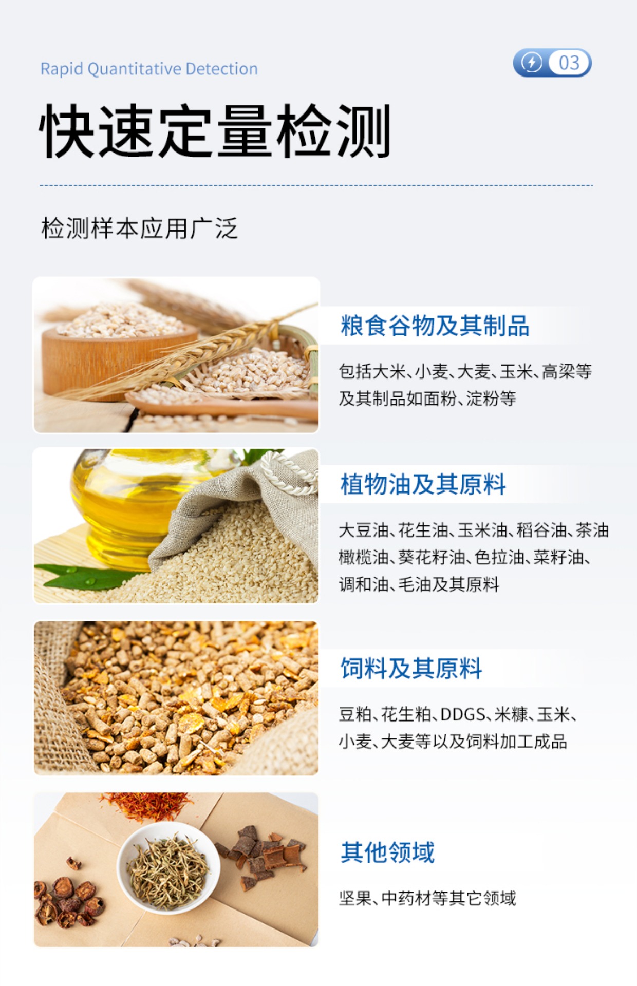 | 重金属镉 | 0-1000ug/kg | 玉米、小麦、麦麸、豆粕、花生粕、玉米胚芽粕、膨化玉米、DDGS、喷浆玉米皮及成品饲料 |